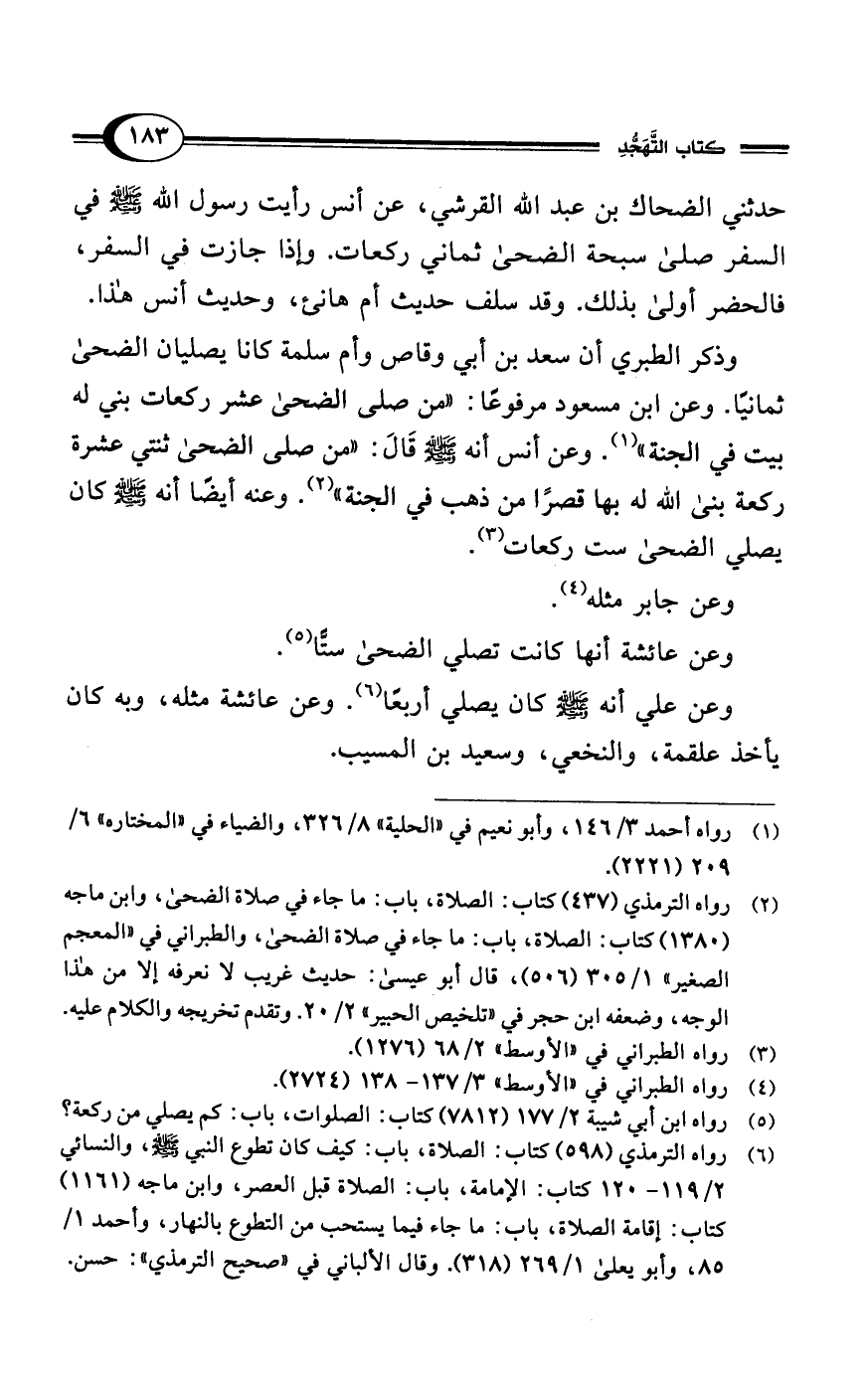 (¬2) رواه الترمذي (437) كتاب: الصلاة، باب: ما جاء في صلاة الضحى، وابن ماجه (1380) كتاب: الصلاة، باب: ما جاء في صلاة الضحى، والطبراني في "المعجم الصغير" 1/ 305 (506)، قال أبو عيسى: حديث غريب لا نعرفه إلا من هذا الوجه، وضعفه ابن حجر في "تلخيص الحبير" 2/ 20. وتقدم تخريجه والكلام عليه.