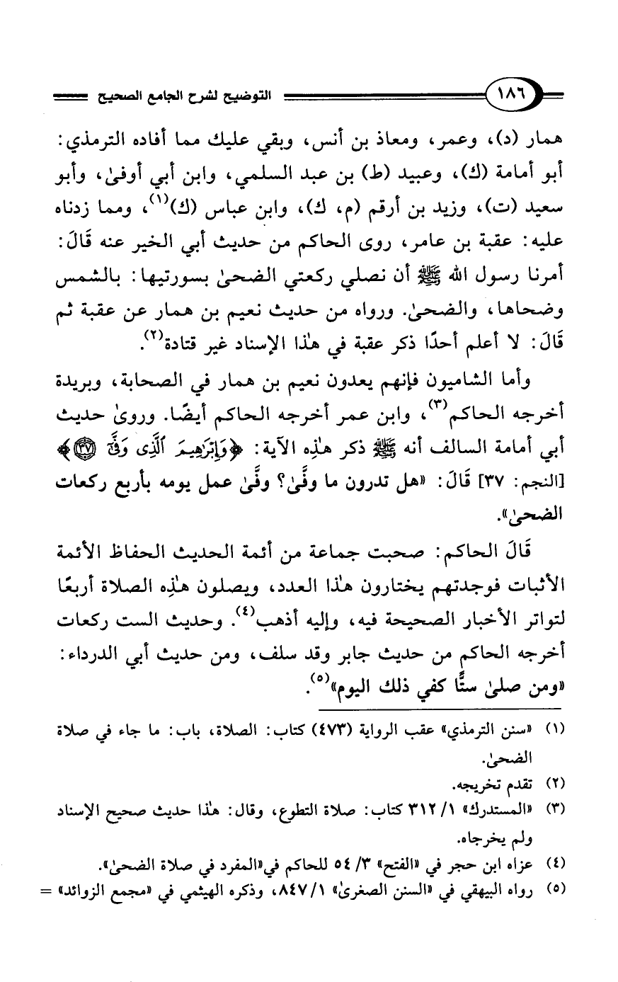 وأما الشاميون فإنهم يعدون نعيم بن همار في الصحابة، وبريدة أخرجه الحاكم (¬3)، وابن عمر أخرجه الحاكم أيضًا. وروىِ حديث أبي أمامة السالف أنه - صلى الله عليه وسلم - ذكر هذِه الآية: {وَإِبْرَاهِيمَ الَّذِي وَفَّى (37)} [النجم: 37] قَالَ: "هل تدرون ما وفَّى؟ وفَّى عمل يومه بأربع ركعات الضحى".