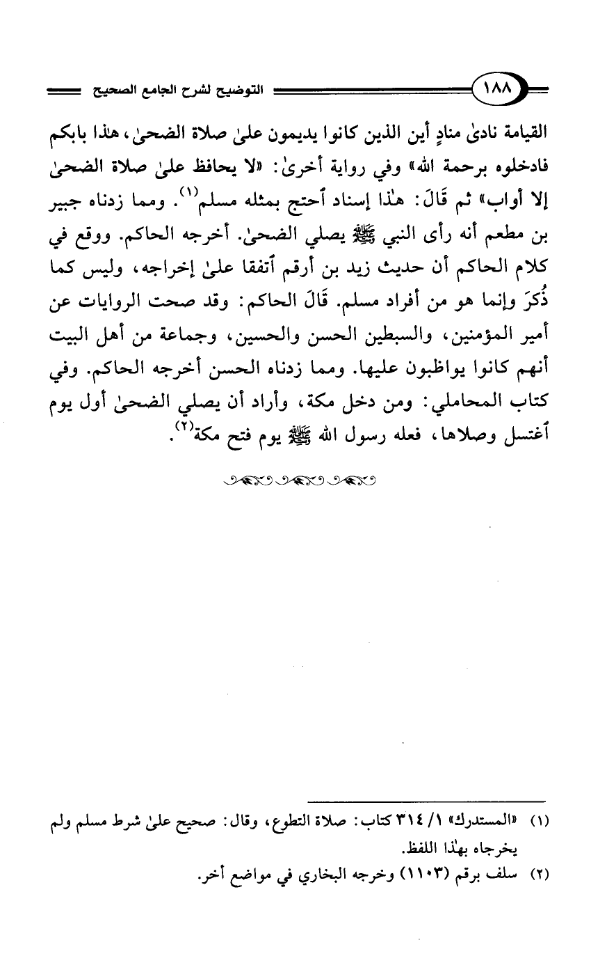 القيامة نادى منادٍ أين الذين كانوا يديمون على صلاة الضحى، هذا بابكم فادلخوه برحمة الله" وفي رواية أخرى: "لا يحافظ على صلاة الضحى إلا أواب" ثم قَالَ: هذا إسناد احتج بمثله مسلم (¬1). ومما زدناه جبير بن مطعم أنه رأى النبي - صلى الله عليه وسلم - يصلي الضحى. أخرجه الحاكم. ووقع في كلام الحاكم أن حديث زيد بن أرقم اتفقا على إخراجه، وليس كما ذُكرَ وإنما هو من أفراد مسلم. قَالَ الحاكم: وقد صحت الروايات عن أمير المؤمنين، والسبطين الحسن والحسين، وجماعة من أهل البيت أنهم كانوا يواظبون عليها. ومما زدناه الحسن أخرجه الحاكم. وفي كتاب المحاملي: ومن دخل مكة، وأراد أن يصلي الضحى أول يوم اغتسل وصلاها، فعله رسول الله - صلى الله عليه وسلم - يوم فتح مكة (¬2).