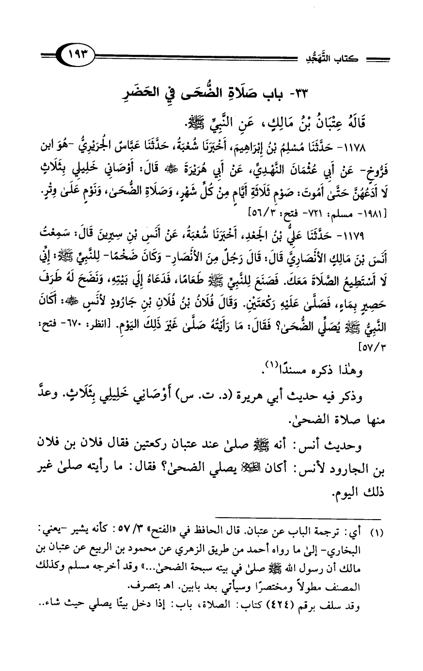 1178 - حَدَّثَنَا مُسْلِمُ بْنُ إِبْرَاهِيمَ، أَخْبَرَنَا شُعْبَةُ، حَدَّثَنَا عَبَّاسٌ الجُرَيْرِيُّ -هُوَ ابْنُ فَرُّوخٍ- عَنْ أَبِي عُثْمَانَ النَّهْديِّ، عَنْ أَبِي هُرَيْرَةَ - رضي الله عنه - قَالَ: أَوْصَانِي خَلِيلِي بِثَلاَثٍ لاَ أَدَعُهُنَّ حَتَّى أَمُوتَ: صَوْمِ ثَلاَثَةِ أَيَّامٍ مِنْ كُلِّ شَهْرٍ، وَصَلاَةِ الضُّحَى، وَنَوْمٍ عَلَى وِتْرٍ. [1981 - مسلم: 721 - فتح: 3/ 56]