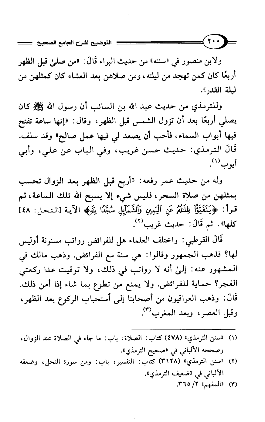 وله من حديث عمر رفعه: "أربع قبل الظهر بعد الزوال تحسب بمثلهن من صلاة السحر، فليس شيء إلا يسبح الله تلك الساعة، ثم قرأ: {يَتَفَيَّأُ ظِلَالُهُ عَنِ اليَمِينِ وَالشَّمَائِلِ سُجَّدًا لِلَّهِ} الآية [النحل: 48] كلها". ثم قَالَ: حديث غريب (¬2).