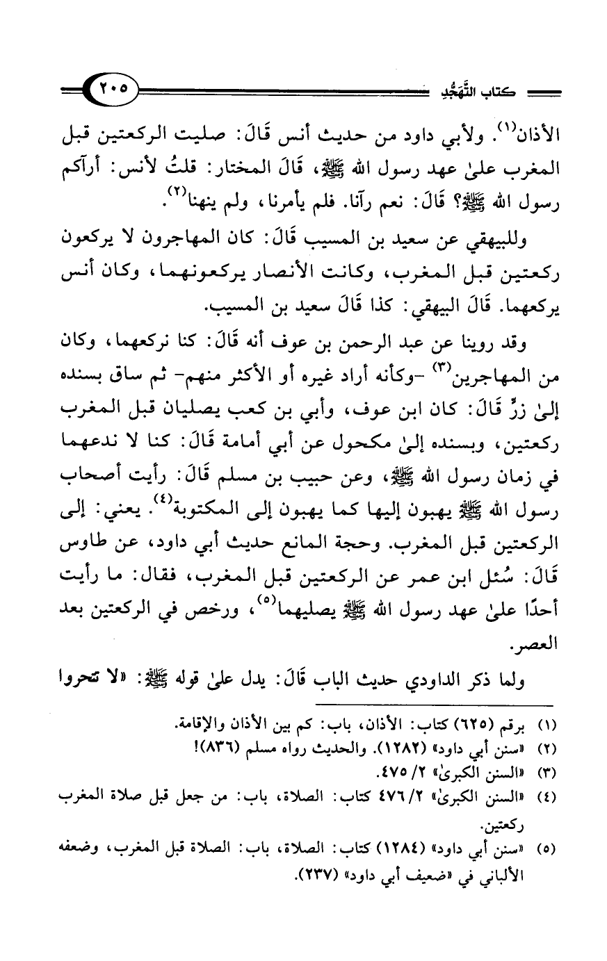 (¬5) "سنن أبي داود" (1284) كتاب: الصلاة، باب: الصلاة قبل المغرب، وضعفه الألباني في "ضعيف أبي داود" (237).