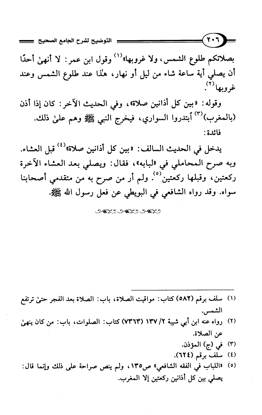 (¬5) "اللباب في الفقه الشافعي" ص 135، ولم ينص صراحة على ذلك وإنما قال: يصلي بين كل أذانين ركعتين إلا المغرب.