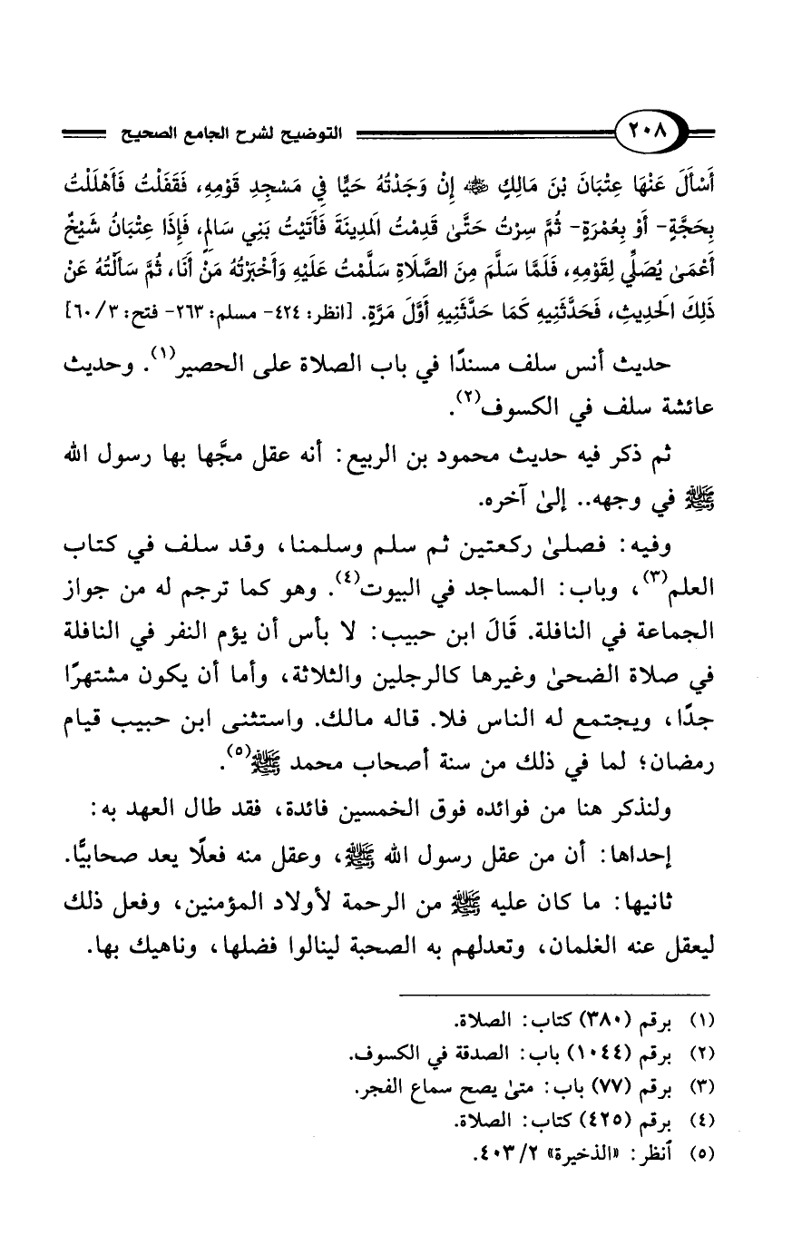 أَسْأَلَ عَنْهَا عِتْبَانَ بْنَ مَالِكٍ - رضي الله عنه - إِنْ وَجَدْتُهُ حَيًّا فِي مَسْجِدِ قَوْمِهِ، فَقَفَلْتُ فَأَهْلَلْتُ بِحَجَّةٍ -أَوْ بِعُمْرَةٍ-، ثُمَّ سِرْتُ حَتَّى قَدِمْتُ المَدِينَةَ فَأَتَيْتُ بَنِي سَالِمٍ، فَإِذَا عِتْبَانُ شَيْخٌ أَعْمَى يُصَلِّي لِقَوْمِهِ، فَلَمَّا سَلَّمَ مِنَ الصَّلاَةِ سَلَّمْتُ عَلَيْهِ وَأَخْبَرْتُهُ مَنْ أَنَا، ثُمَّ سَأَلْتُهُ عَنْ ذَلِكَ الحَدِيثِ، فَحَدَّثَنِيهِ كَمَا حَدَّثَنِيهِ أَوَّلَ مَرَّةٍ. [انظر: 424 - مسلم: 263 - فتح: 3/ 60]
