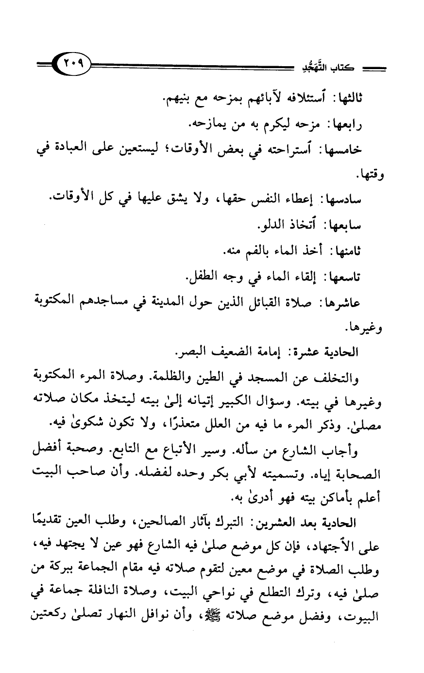 الحادية بعد العشرين: التبرك بآثار الصالحين، وطلب العين تقديمًا على الاجتهاد، فإن كل موضع صلى فيه الشارع فهو عين لا يجتهد فيه، وطلب الصلاة في موضع معين لتقوم صلاته فيه مقام الجماعة ببركة من صلى فيه، وترك التطلع في نواحي البيت، وصلاة النافلة جماعة في البيوت، وفضل موضع صلاته - صلى الله عليه وسلم -، وأن نوافل النهار تصلى ركعتين