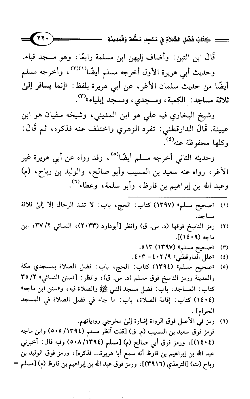 (¬5) "صحيح مسلم" (1394) كتاب: الحج، باب: فضل الصلاة بمسجدي مكة والمدينة ورمز الناسخ فوق مسلم (د. س. ق)، وانظر: ["سنن النسائي" 2/ 35 كتاب: المساجد، باب: فضل مسجد النبي - صلى الله عليه وسلم - والصلاة فيه، و"سنن ابن ماجه" (1404) كتاب: إقامة الصلاة، باب: ما جاء في فضل الصلاة في المسجد الحرام].