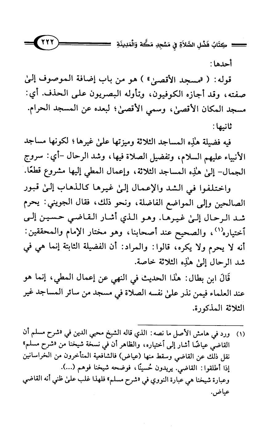 واختلفوا في الشد والإعمال إلى غيرها كالذهاب إلى قبور الصالحين وإلى المواضع الفاضلة، ونحو ذلك، فقال الجويني: يحرم شد الرحال إلى غيرها. وهو الذي أشار القاضي حسين إلى اختياره (¬1)، والصحيح عند أصحابنا، وهو مختار الإمام والمحققين: أنه لا يحرم ولا يكره، قالوا: والمراد: أن الفضيلة الثابتة إنما هي في شد الرحال إلى هذِه الثلاثة خاصة.