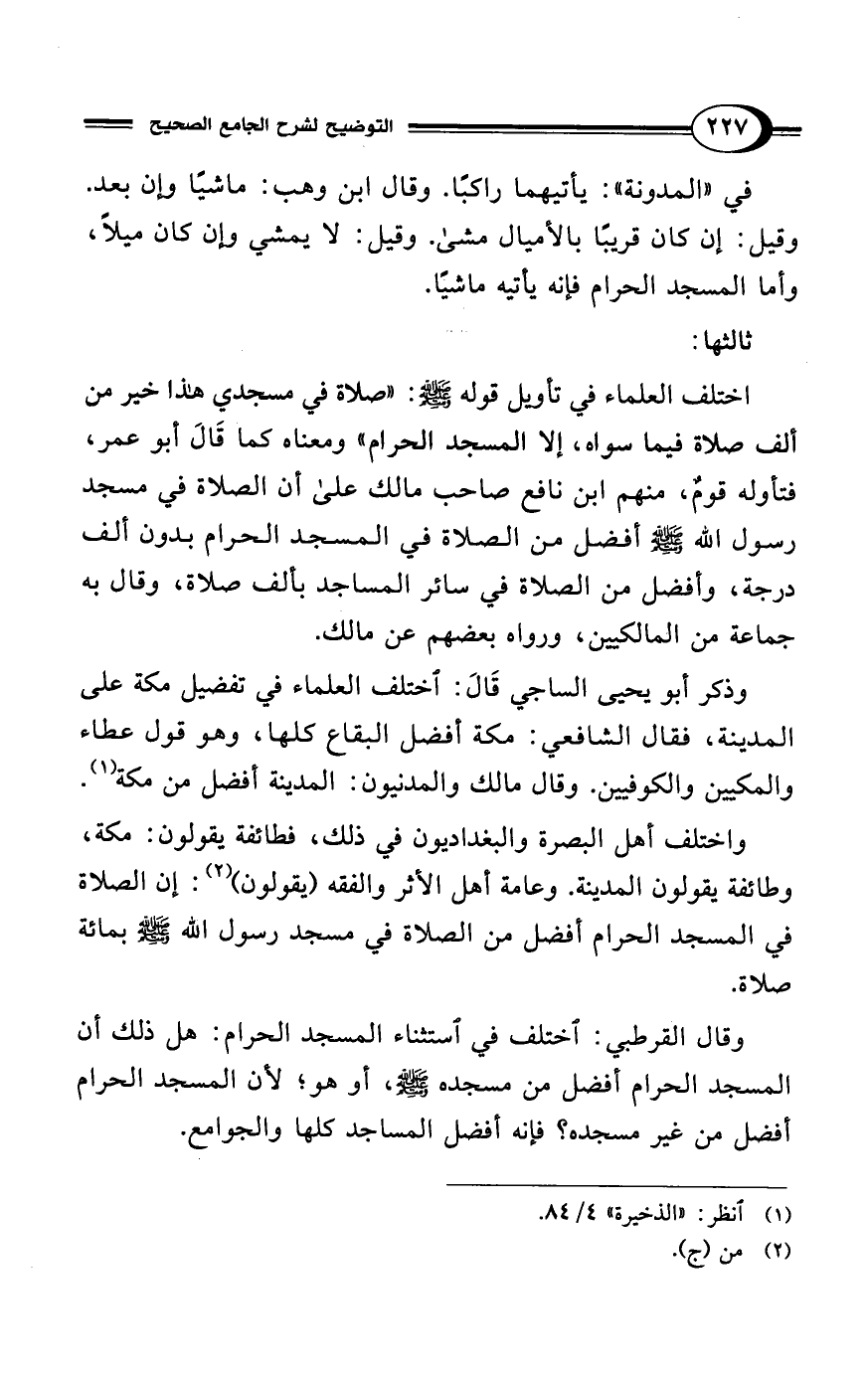 وقال القرطبي: اختلف في استثناء المسجد الحرام: هل ذلك أن المسجد الحرام أفضل من مسجده - صلى الله عليه وسلم -، أو هو؛ لأن المسجد الحرام أفضل من غير مسجده؟ فإنه أفضل المساجد كلها والجوامع.