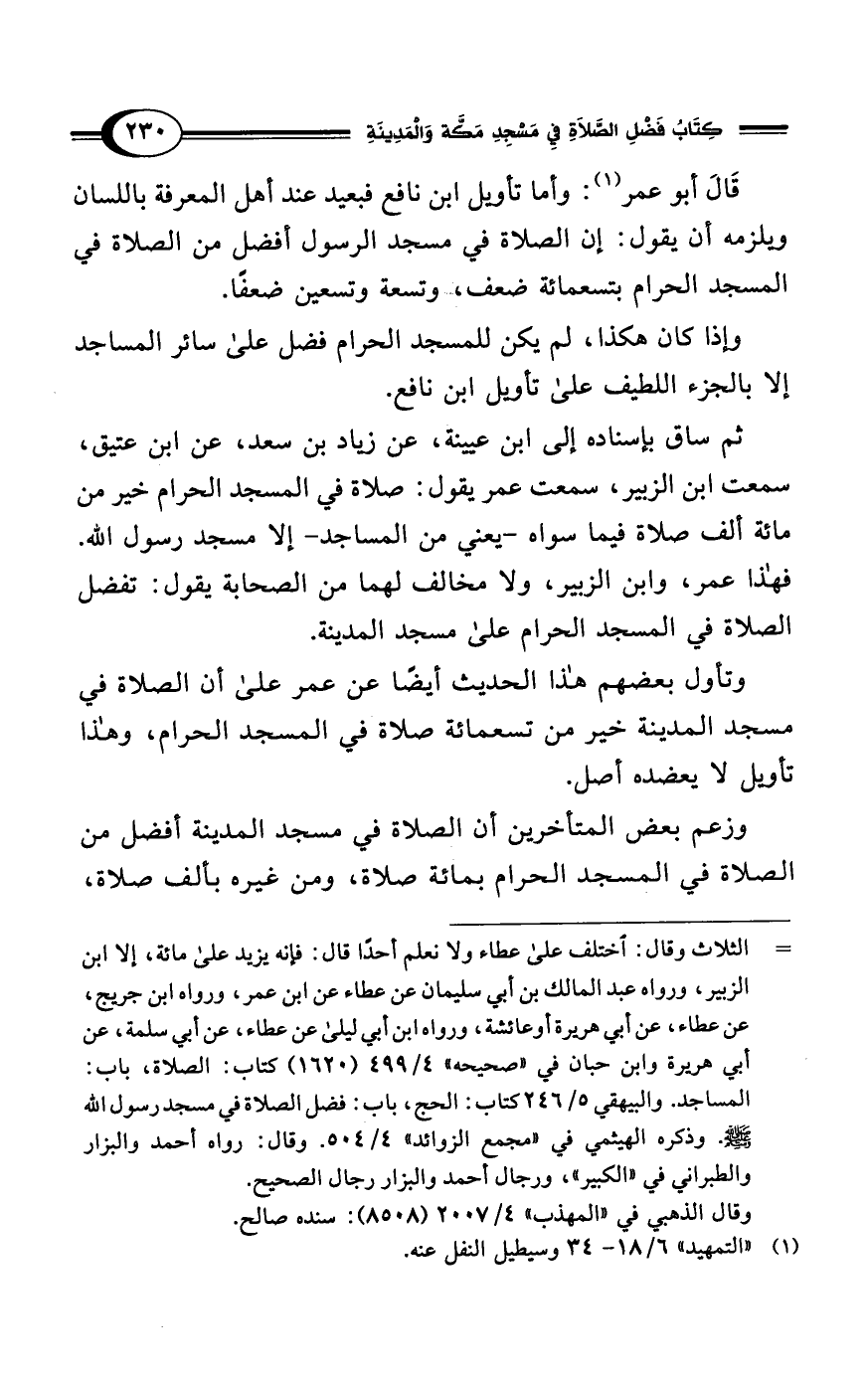 قَالَ أبو عمر (¬1): وأما تأويل ابن نافع فبعيد عند أهل المعرفة باللسان ويلزمه أن يقول: إن الصلاة في مسجد الرسول أفضل من الصلاة في المسجد الحرام بتسعمائة ضعف،، وتسعة وتسعين ضعفًا.