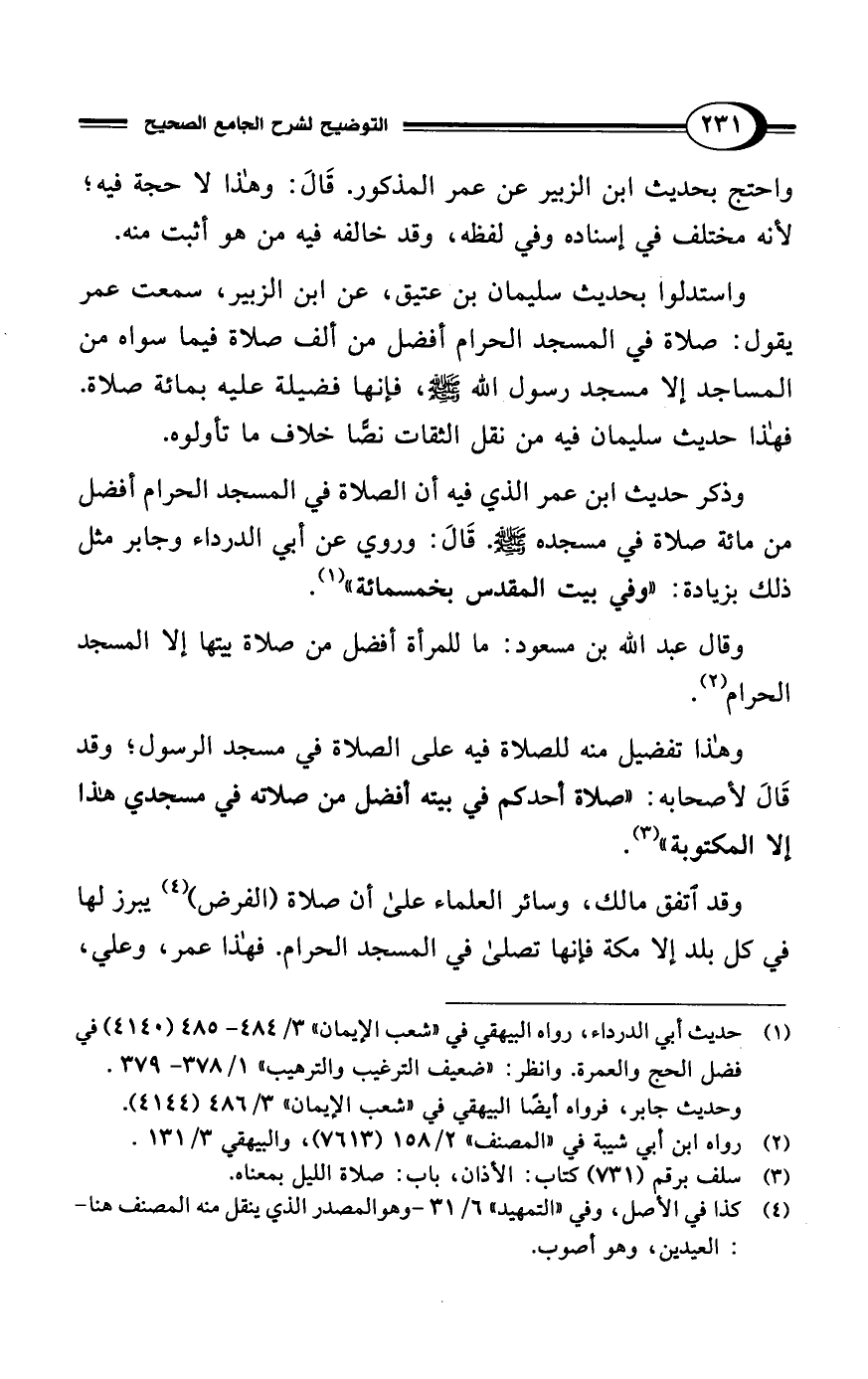 واستدلوا بحديث سليمان بن عتيق، عن ابن الزبير، سمعت عمر يقول: صلاة في المسجد الحرام أفضل من ألف صلاة فيما سواه من المساجد إلا مسجد رسول الله - صلى الله عليه وسلم -، فإنها فضيلة عليه بمائة صلاة. فهذا حديث سليمان فيه من نقل الثقات نصًّا خلاف ما تأولوه.