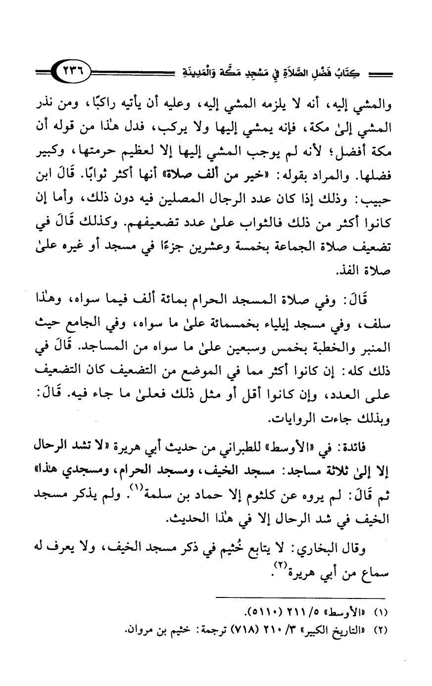 فائدة: في "الأوسط" للطبراني من حديث أبي هريرة "لا تشد الرحال إلا إلى ثلاثة مساجد: مسجد الخيف، ومسجد الحرام، ومسجدي هذا" ثم قَالَ: لم يروه عن كلثوم إلا حماد بن سلمة (¬1). ولم يذكر مسجد الخيف في شد الرحال إلا في هذا الحديث.