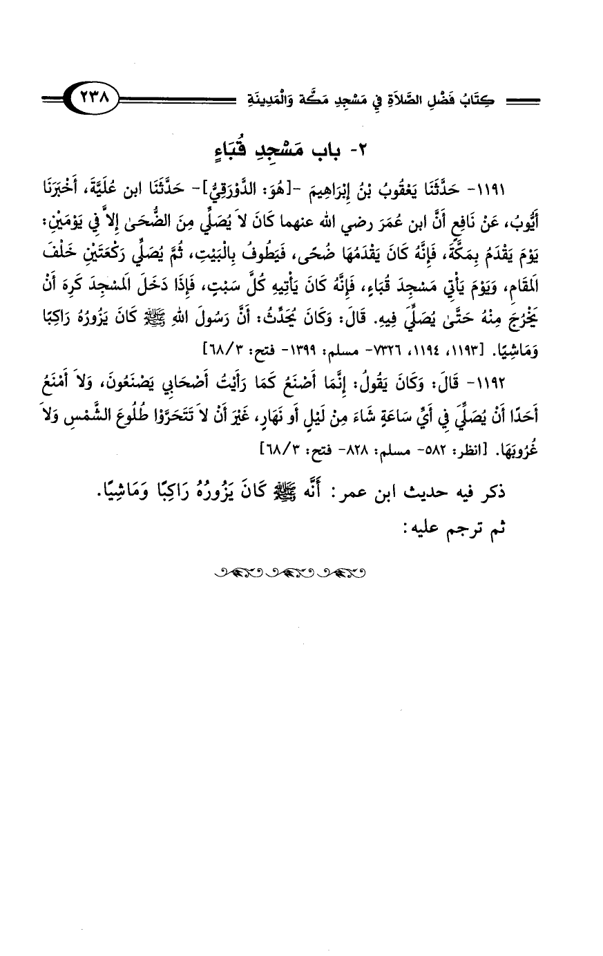 1191 - حَدَّثَنَا يَعْقُوبُ بْنُ إِبْرَاهِيمَ -[هُوَ: الدَّوْرَقِيُّ]- حَدَّثَنَا ابْنُ عُلَيَّةَ، أَخْبَرَنَا أَيُّوبُ، عَنْ نَافِعٍ أَنَّ ابْنَ عُمَرَ رضي الله عنهما كَانَ لاَ يُصَلِّي مِنَ الضُّحَى إِلاَّ فِي يَوْمَيْنِ: يَوْمَ يَقْدَمُ بِمَكَّةَ، فَإِنَّهُ كَانَ يَقْدَمُهَا ضُحًى، فَيَطُوفُ بِالبَيْتِ، ثُمَّ يُصَلِّي رَكْعَتَيْنِ خَلْفَ المَقَامِ، وَيَوْمَ يَأْتِي مَسْجِدَ قُبَاءٍ، فَإِنَّهُ كَانَ يَأْتِيهِ كُلَّ سَبْتٍ، فَإِذَا دَخَلَ المَسْجِدَ كَرِهَ أَنْ يَخْرُجَ مِنْهُ حَتَّى يُصَلِّيَ فِيهِ. قَالَ: وَكَانَ يُحَدِّثُ: أَنَّ رَسُولَ اللهِ - صلى الله عليه وسلم - كَانَ يَزُورُهُ رَاكِبًا وَمَاشِيًا. [1193، 1194، 7326 - مسلم: 1399 - فتح: 3/ 68]