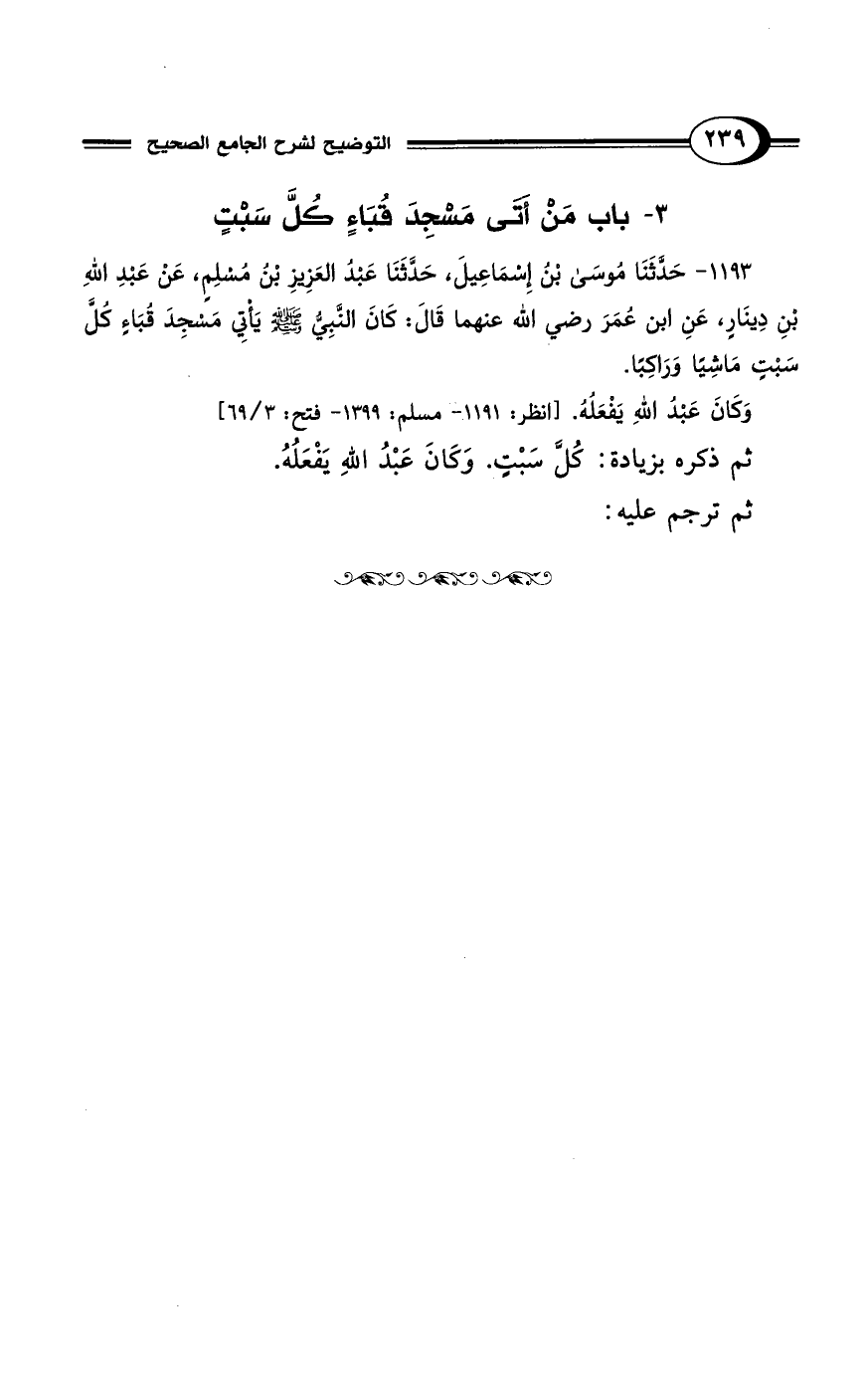 1193 - حَدَّثَنَا مُوسَى بْنُ إِسْمَاعِيلَ، حَدَّثَنَا عَبْدُ العَزِيزِ بْنُ مُسْلِمٍ، عَنْ عَبْدِ اللهِ بْنِ دِينَارٍ، عَنِ ابْنِ عُمَرَ رضي الله عنهما قَالَ: كَانَ النَّبِيُّ - صلى الله عليه وسلم - يَأْتِي مَسْجِدَ قُبَاءٍ كُلَّ سَبْتٍ مَاشِيًا وَرَاكِبًا.