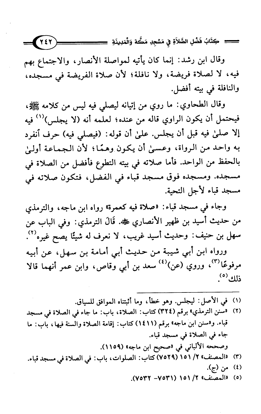 (¬2) "سنن الترمذي" برقم (324) كتاب: الصلاة، باب: ما جاء في الصلاة في مسجد قباء. و"سنن ابن ماجه" برقم (1411) كتاب: إقامة الصلاة والسنة فيها، باب: ما جاء في الصلاة في مسجد قباء.