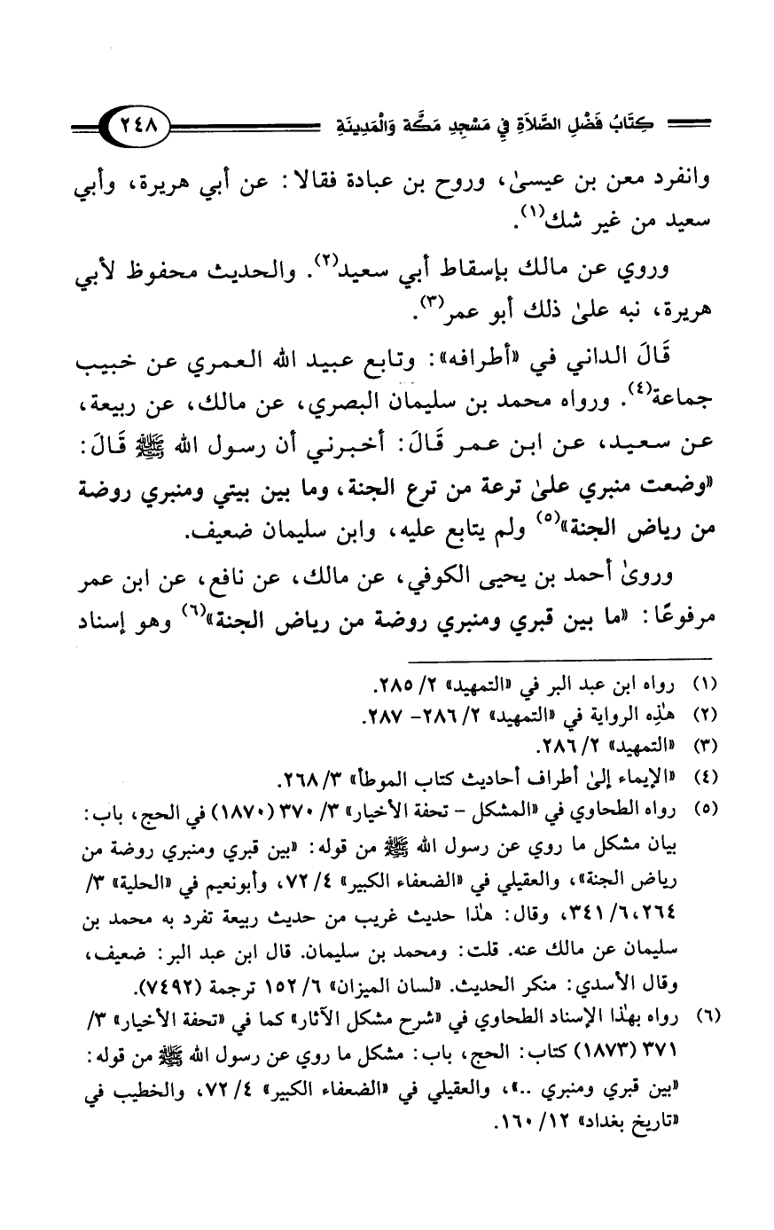 (¬5) رواه الطحاوي في "المشكل- تحفة الأخيار" 3/ 370 (1870) في الحج، باب: بيان مشكل ما روي عن رسول الله - صلى الله عليه وسلم - من قوله: "بين قبري ومنبري روضة من رياض الجنة"، والعقيلي في "الضعفاء الكبير" 4/ 72، وأبونعيم في "الحلية" 3/ 264، 6/ 341، وقال: هذا حديث غريب من حديث ربيعة تفرد به محمد بن سليمان عن مالك عنه. قلت: ومحمد بن سليمان. قال ابن عبد البر: ضعيف، وقال الأسدي: منكر الحديث. "لسان الميزان" 6/ 152 ترجمة (7492).