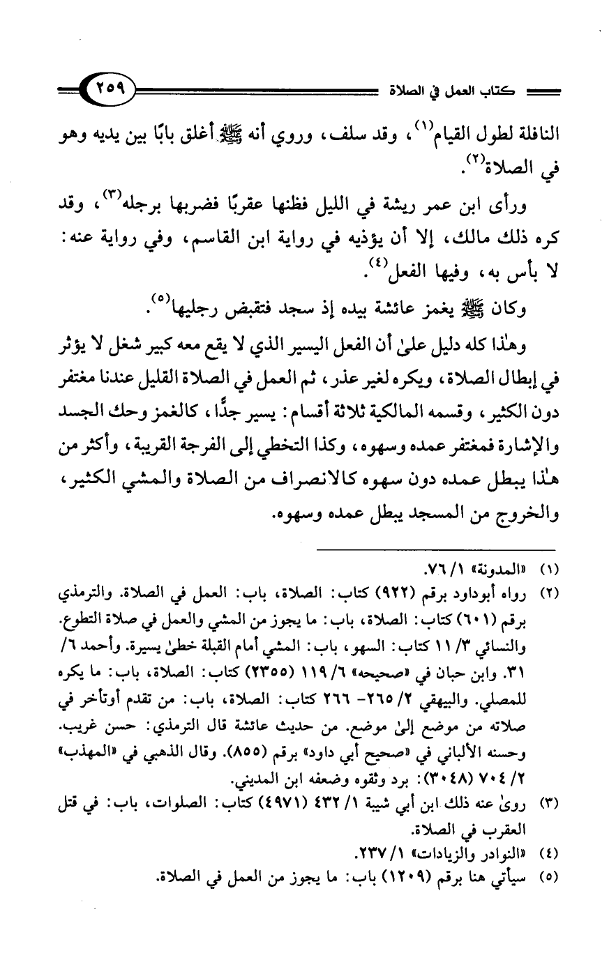(¬2) رواه أبو داود برقم (922) كتاب: الصلاة، باب: العمل في الصلاة. والترمذي برقم (601) كتاب: الصلاة، باب: ما يجوز من المشي والعمل في صلاة التطوع. والنسائي 3/ 11 كتاب: السهو، باب: المشي أمام القبلة خطى يسيرة. وأحمد 6/ 31. وابن حبان في "صحيحه" 6/ 119 (2355) كتاب: الصلاة، باب: ما يكره للمصلي. والبيهقي 2/ 265 - 266 كتاب: الصلاة، باب: من تقدم أو تأخر في صلاته من موضع إلى موضع. من حديث عائشة قال الترمذي: حسن غريب. وحسنه الألباني في "صحيح أبي داود" برقم (855). وقال الذهبي في "المهذب" 2/ 704 (3048): برد وثقوه وضعفه ابن المديني.
