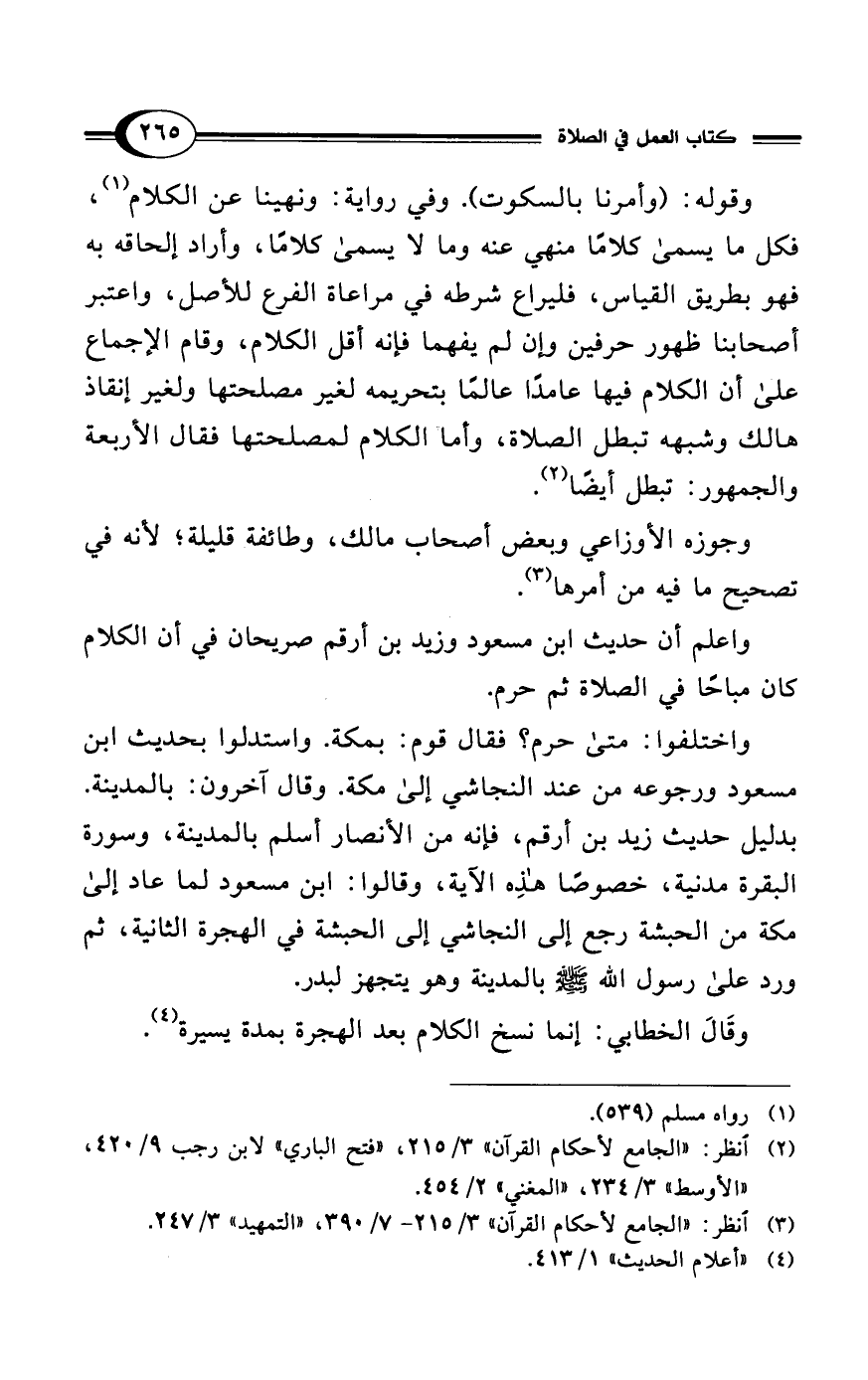 واعلم أن حديث ابن مسعود وزيد بن أرقم صريحان في أن الكلام كان مباحًا في الصلاة ثم حرم.