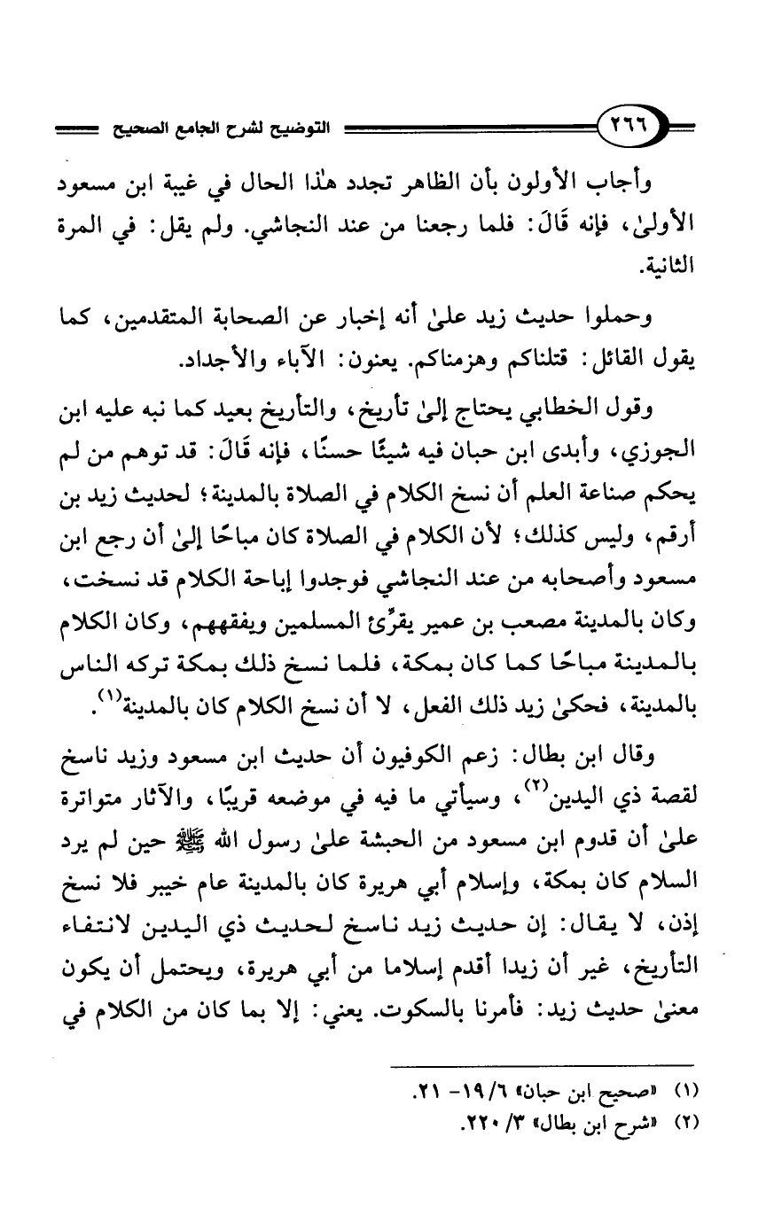 وقول الخطابي يحتاج إلى تأريخ، والتأريخ بعيد كما نبه عليه ابن الجوزي، وأبدى ابن حبان فيه شيئًا حسنًا، فإنه قَالَ: قد توهم من لم يحكم صناعة العلم أن نسخ الكلام في الصلاة بالمدينة؛ لحديث زيد بن أرقم، وليس كذلك؛ لأن الكلام في الصلاة كان مباحًا إلى أن رجع ابن مسعود وأصحابه من عند النجاشي فوجدوا إباحة الكلام قد نسخت، وكان بالمدينة مصعب بن عمير يقرِّئ المسلمين ويفقههم، وكان الكلام بالمدينة مباحًا كما كان بمكة، فلما نسخ ذلك بمكة تركه الناس بالمدينة، فحكى زيد ذلك الفعل، لا أن نسخ الكلام كان بالمدينة (¬1).