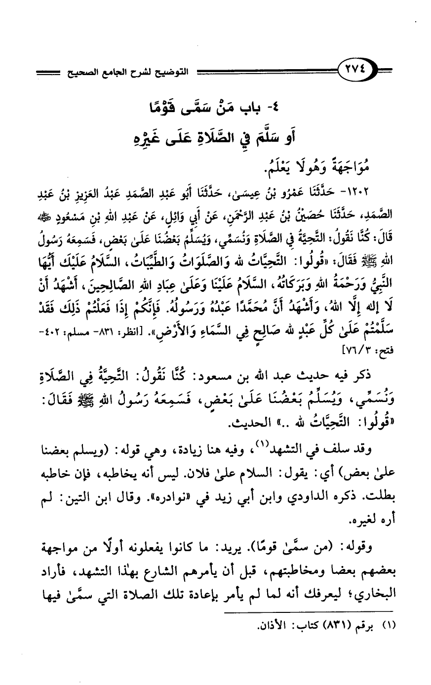 ذكر فيه حديث عبد الله بن مسعود: كُنَّا نَقُولُ: التَّحِيَّةُ فِي الصَّلاةِ وَنُسَمِّي، وَيُسَلِّمُ بَعْضُنَا عَلَى بَعْضٍ، فَسَمِعَهُ رَسُولُ اللهِ - صلى الله عليه وسلم - فَقَالَ: "قُولُوا: التَّحِيَّاتُ لله .. " الحديث.