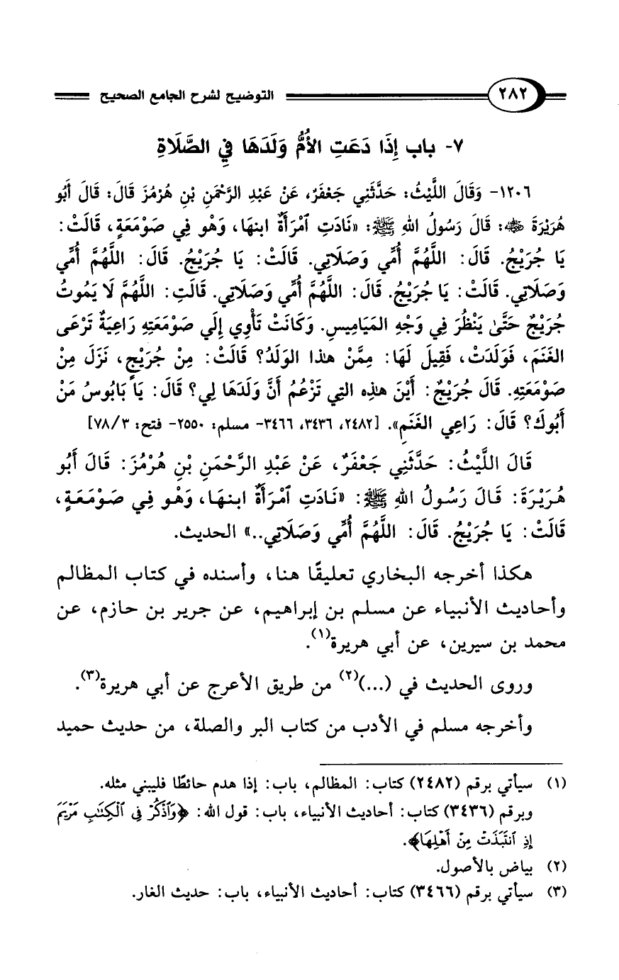 1206 - وَقَالَ اللَّيْثُ: حَدَّثَنِي جَعْفَرٌ، عَنْ عَبْدِ الرَّحْمَنِ بْنِ هُرْمُزَ قَالَ: قَالَ أَبُو هُرَيْرَةَ - رضي الله عنه -: قَالَ رَسُولُ اللهِ - صلى الله عليه وسلم -: "نَادَتِ امْرَأَةٌ ابْنَهَا، وَهْوَ فِي صَوْمَعَةٍ قَالَتْ: يَا جُرَيْجُ. قَالَ: اللَّهُمَّ أُمِّي وَصَلاَتِي. قَالَتْ: يَا جُرَيْجُ. قَالَ: اللَّهُمَّ أُمِّي وَصَلاَتِي. قَالَتْ: يَا جُرَيْجُ. قَالَ: اللَّهُمَّ أُمِّي وَصَلاَتِي. قَالَتِ: اللَّهُمَّ لاَ يَمُوتُ جُرَيْجٌ حَتَّى يَنْظُرَ فِي وَجْهِ المَيَامِيسِ. وَكَانَتْ تَأْوِي إِلَي صَوْمَعَتِهِ رَاعِيَةٌ تَرْعَى الغَنَمَ، فَوَلَدَتْ، فَقِيلَ لَهَا: مِمَّنْ هَذَا الوَلَدُ؟ قَالَتْ: مِنْ جُرَيْجٍ، نَزَلَ مِنْ صَوْمَعَتِهِ. قَالَ جُرَيْجٌ: أَيْنَ هَذِهِ التِي تَزْعُمُ أَنَّ وَلَدَهَا لِي؟ قَالَ: يَا بَابُوسُ مَنْ أَبُوكَ؟ قَالَ: رَاعِى الغَنَمِ". [2482، 3436، 3466 - مسلم: 2550 - فتح: 3/ 78]