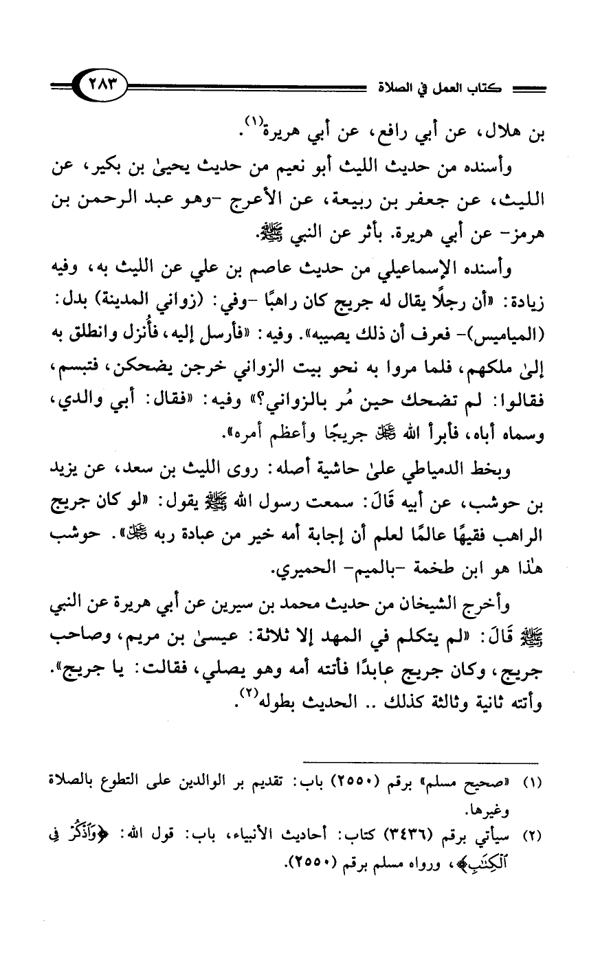 وأخرج الشيخان من حديث محمد بن سيرين عن أبي هريرة عن النبي - صلى الله عليه وسلم - قَالَ: "لم يتكلم في المهد إلا ثلاثة: عيسى بن مريم، وصاحب جريج، وكان جريج عابدًا فأتته أمه وهو يصلي، فقالت: يا جريج". وأتته ثانية وثالثة كذلك .. الحديث بطوله (¬2).