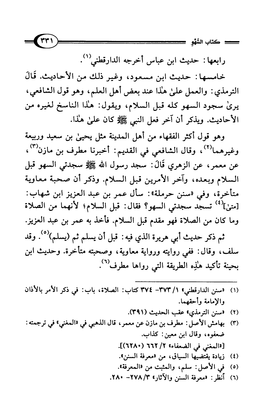خامسها: حديث ابن مسعود، وغير ذلك من الأحاديث. قَالَ الترمذي: والعمل على هذا عند بعض أهل العلم، وهو قول الشافعي، يرى سجود السهو كله قبل السلام، ويقول: هذا الناسخ لغيره من الأحاديث. ويذكر أن آخر فعل النبي - صلى الله عليه وسلم - كان على هذا.