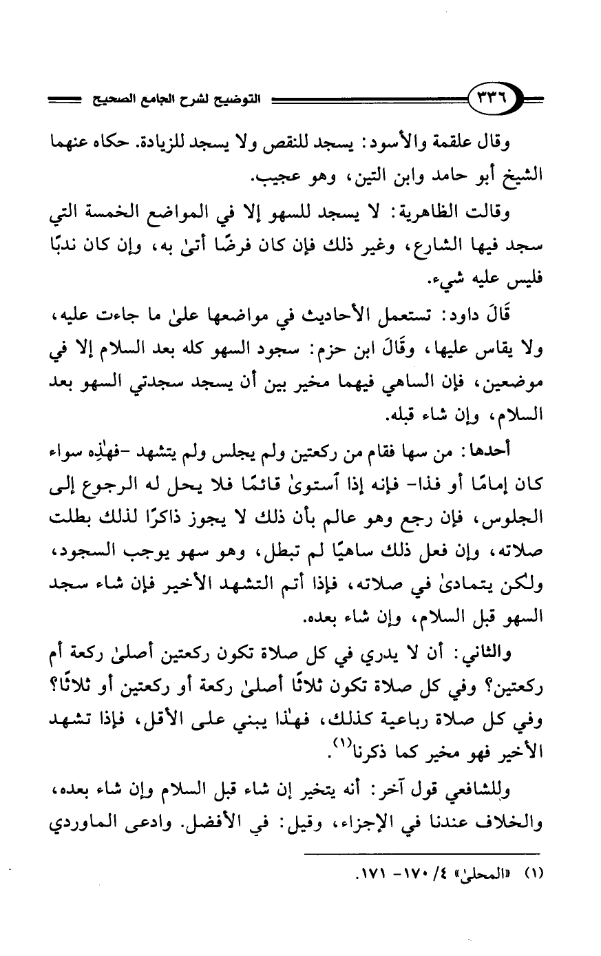قَالَ داود: تستعمل الأحاديث في مواضعها على ما جاءت عليه، ولا يقاس عليها، وقَالَ ابن حزم: سجود السهو كله بعد السلام إلا في موضعين، فإن الساهي فيهما مخير بين أن يسجد سجدتي السهو بعد السلام، وإن شاء قبله.