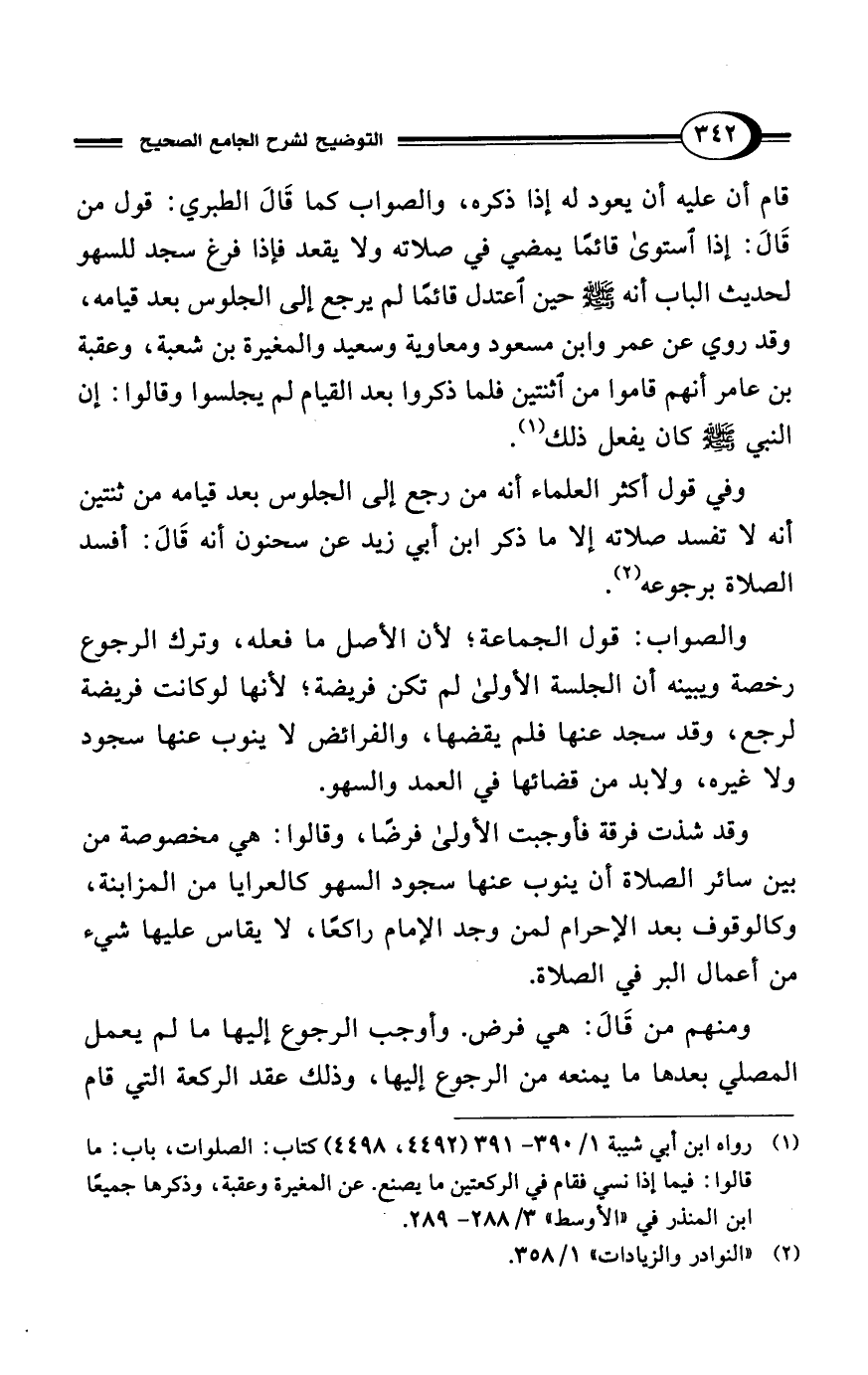 وفي قول أكثر العلماء أنه من رجع إلى الجلوس بعد قيامه من ثنتين أنه لا تفسد صلاته إلا ما ذكر ابن أبي زيد عن سحنون أنه قَالَ: أفسد الصلاة برجوعه (¬2).