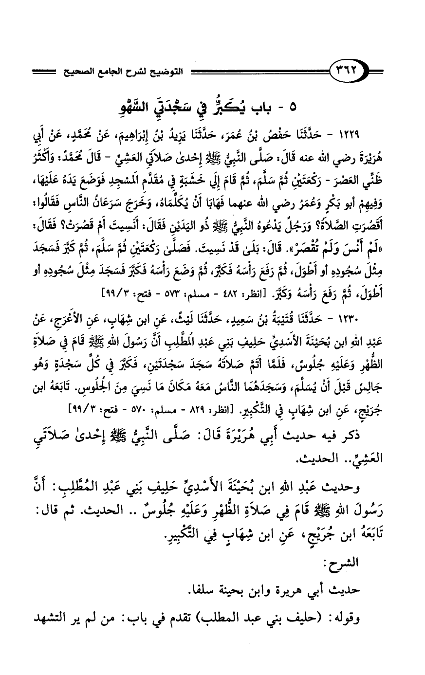 1229 - حَدَّثَنَا حَفْصُ بْنُ عُمَرَ، حَدَّثَنَا يَزِيدُ بْنُ إِبْرَاهِيمَ، عَنْ مُحَمَّدٍ، عَنْ أَبِي هُرَيْرَةَ رضي الله عنه قَالَ: صَلَّى النَّبِيُّ - صلى الله عليه وسلم - إِحْدَى صَلاَتَيِ العَشِيِّ -قَالَ مُحَمَّدٌ: وَأَكْثَرُ ظَنِّي العَصْرَ- رَكْعَتَيْنِ ثُمَّ سَلَّمَ، ثُمَّ قَامَ إِلَي خَشَبَةٍ فِي مُقَدَّمِ المَسْجِدِ فَوَضَعَ يَدَهُ عَلَيْهَا، وَفِيهِمْ أَبُو بَكْرٍ وَعُمَرُ رضي الله عنهما فَهَابَا أَنْ يُكَلِّمَاهُ، وَخَرَجَ سَرَعَانُ النَّاسِ فَقَالُوا: أَقَصُرَتِ الصَّلاَةُ؟ وَرَجُلٌ يَدْعُوهُ النَّبِيُّ - صلى الله عليه وسلم - ذُو اليَدَيْنِ فَقَالَ: أَنَسِيتَ أَمْ قَصُرَتْ؟ فَقَالَ: "لَمْ أَنْسَ وَلَمْ تُقْصَرْ". قَالَ: بَلَى قَدْ نَسِيتَ. فَصَلَّى رَكْعَتَيْنِ ثُمَّ سَلَّمَ، ثُمَّ كَبَّرَ فَسَجَدَ مِثْلَ سُجُودِهِ أَوْ أَطْوَلَ، ثُمَّ رَفَعَ رَأْسَهُ فَكَبَّرَ، ثُمَّ وَضَعَ رَأْسَهُ فَكَبَّرَ فَسَجَدَ مِثْلَ سُجُودِهِ أَوْ أَطْوَلَ، ثُمَّ رَفَعَ رَأْسَهُ وَكَبَّرَ. [انظر: 482 - مسلم: 573 - فتح: 3/ 99]