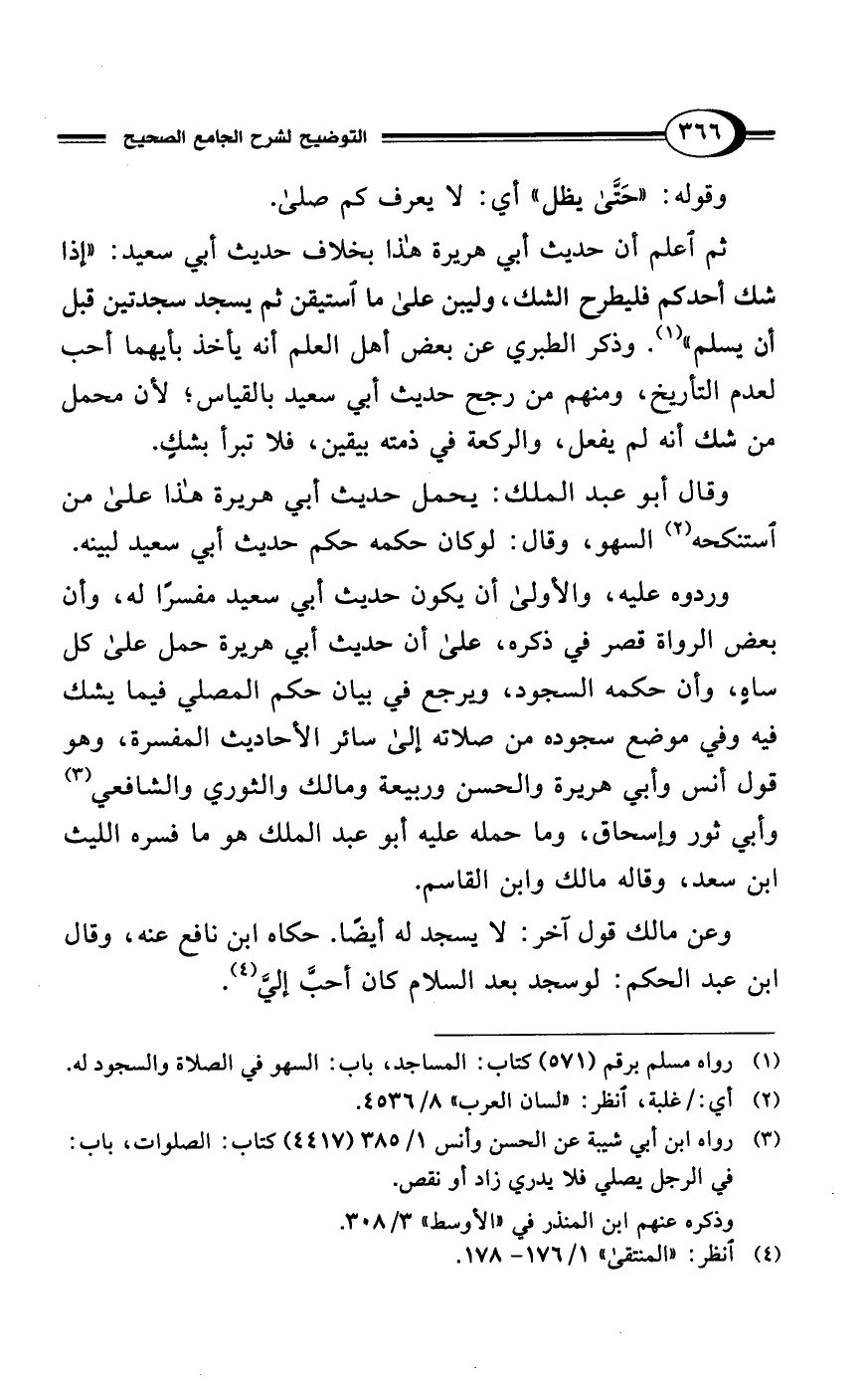 وردوه عليه، والأولى أن يكون حديث أبي سعيد مفسرًا له، وأن بعض الرواة قصر في ذكره، على أن حديث أبي هريرة حمل على كل ساهٍ، وأن حكمه السجود، ويرجع في بيان حكم المصلي فيما يشك فيه وفي موضع سجوده من صلاته إلى سائر الأحاديث المفسرة، وهو قول أنس وأبي هريرة والحسن وربيعة ومالك والثوري والشافعي (¬3) وأبي ثور وإسحاق، وما حمله عليه أبو عبد الملك هو ما فسره الليث ابن سعد، وقاله مالك وابن القاسم.