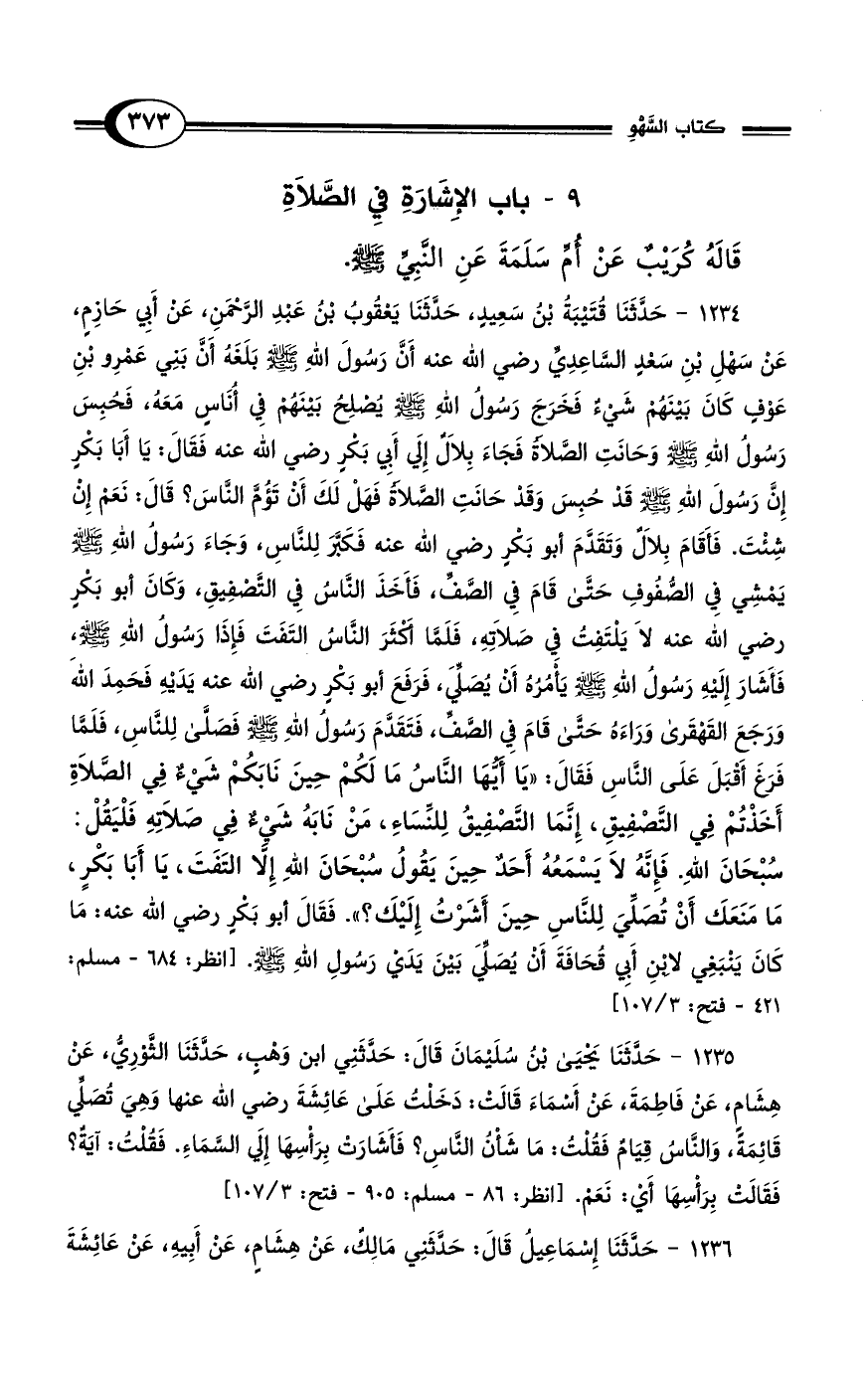 1234 - حَدَّثَنَا قُتَيْبَةُ بْنُ سَعِيدٍ، حَدَّثَنَا يَعْقُوبُ بْنُ عَبْدِ الرَّحْمَنِ، عَنْ أَبِي حَازِمٍ، عَنْ سَهْلِ بْنِ سَعْدٍ السَّاعِدِيِّ رضي الله عنه أَنَّ رَسُولَ اللهِ - صلى الله عليه وسلم - بَلَغَهُ أَنَّ بَنِي عَمْرِو بْنِ عَوْفٍ كَانَ بَيْنَهُمْ شَيْءٌ فَخَرَجَ رَسُولُ اللهِ - صلى الله عليه وسلم - يُصْلِحُ بَيْنَهُمْ فِي أُنَاسٍ مَعَهُ، فَحُبِسَ رَسُولُ اللهِ - صلى الله عليه وسلم - وَحَانَتِ الصَّلاَةُ فَجَاءَ بِلاَلٌ إِلَى أَبِي بَكْرٍ رضي الله عنه فَقَالَ: يَا أَبَا بَكْرٍ إِنَّ رَسُولَ اللهِ - صلى الله عليه وسلم - قَدْ حُبِسَ وَقَدْ حَانَتِ الصَّلاَةُ فَهَلْ لَكَ أَنْ تَؤُمَّ؟ النَّاسَ قَالَ: نَعَمْ إِنْ شِئْتَ. فَأَقَامَ بِلاَلٌ وَتَقَدَّمَ أَبُو بَكْرٍ رضي الله عنه فَكَبَّرَ لِلنَّاسِ وَجَاءَ رَسُولُ اللهِ - صلى الله عليه وسلم - يَمْشِي فِي الصُّفُوفِ حَتَّى قَامَ فِي الصَّفِّ، فَأَخَذَ النَّاسُ فِي التَّصْفِيقِ، وَكَانَ أَبُو بَكْرٍ رضي الله عنه لاَ يَلْتَفِتُ فِي صَلاَتِهِ، فَلَمَّا أَكْثَرَ النَّاسُ التَفَتَ فَإِذَا رَسُولُ اللهِ - صلى الله عليه وسلم -، فَأَشَارَ إِلَيْهِ رَسُولُ اللهِ - صلى الله عليه وسلم - يَأْمُرُهُ أَنْ يُصَلِّيَ، فَرَفَعَ أَبُو بَكْرٍ رضي الله عنه يَدَيْهِ فَحَمِدَ اللهَ وَرَجَعَ القَهْقَرَى وَرَاءَهُ حَتَّى قَامَ فِي الصَّفِّ، فَتَقَدَّمَ رَسُولُ اللهِ - صلى الله عليه وسلم - فَصَلَّى لِلنَّاسِ، فَلَمَّا فَرَغَ أَقْبَلَ عَلَى النَّاسِ فَقَالَ: "يَا أَيُّهَا النَّاسُ مَا لَكُمْ حِينَ نَابَكُمْ شَيْءٌ فِي الصَّلاَةِ أَخَذْتُمْ فِي التَّصْفِيقِ، إِنَّمَا التَّصْفِيقُ لِلنِّسَاءِ، مَنْ نَابَهُ شَيْءٌ فِي صَلاَتِهِ فَلْيَقُلْ سُبْحَانَ اللهِ. فَإِنَّهُ لاَ يَسْمَعُهُ أَحَدٌ حِينَ يَقُولُ سُبْحَانَ اللهِ إِلاَّ التَفَتَ، يَا أَبَا بَكْرٍ، مَا مَنَعَكَ أَنْ تُصَلِّيَ لِلنَّاسِ حِينَ أَشَرْتُ إِلَيْكَ؟ ". فَقَالَ أَبُو بَكْرٍ رضي الله عنه: مَا كَانَ يَنْبَغِي لاِبْنِ أَبِي قُحَافَةَ أَنْ يُصَلِّيَ بَيْنَ يَدَيْ رَسُولِ اللهِ - صلى الله عليه وسلم -. [انظر: 684 - مسلم: 421 - فتح: 3/ 107]