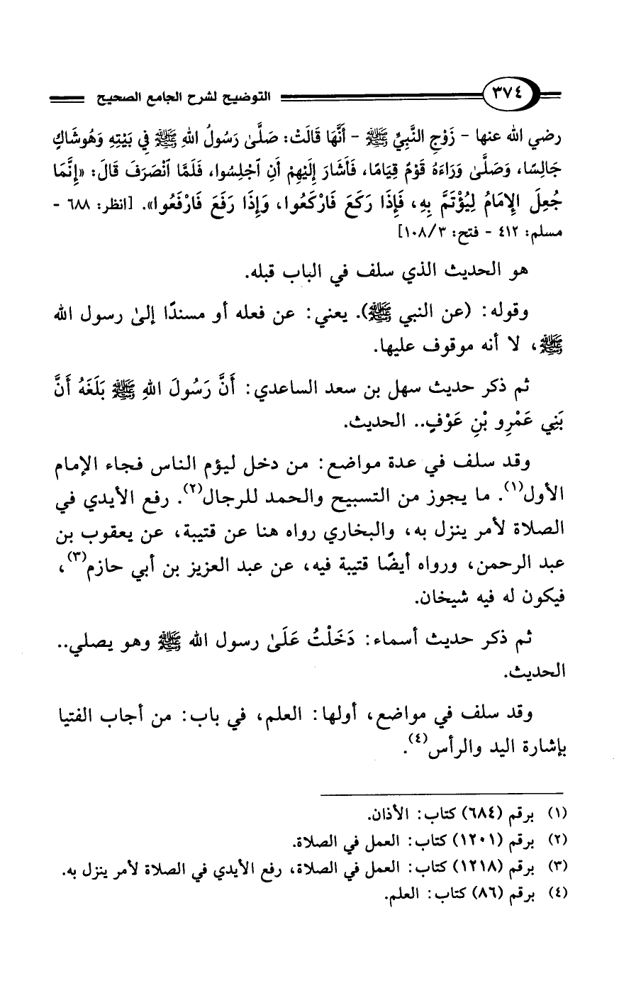 رضي الله عنها -زَوْجِ النَّبِيِّ - صلى الله عليه وسلم - أَنَّهَا قَالَتْ: صَلَّى رَسُولُ اللهِ - صلى الله عليه وسلم - فِي بَيْتِهِ وَهُوَ شَاكٍ جَالِسًا، وَصَلَّى وَرَاءَهُ قَوْمٌ قِيَامًا، فَأَشَارَ إِلَيْهِمْ أَنِ اجْلِسُوا، فَلَمَّا انْصَرَفَ قَالَ: "إِنَّمَا جُعِلَ الإِمَامُ لِيُؤْتَمَّ بِهِ، فَإِذَا رَكَعَ فَارْكَعُوا، وَإِذَا رَفَعَ فَارْفَعُوا". [انظر: 688 - مسلم: 412 - فتح: 3/ 108]