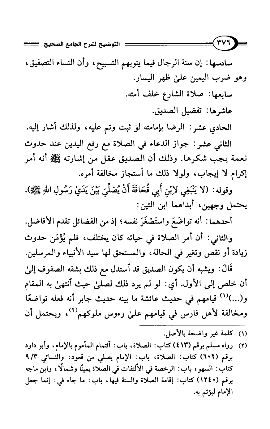 (¬2) رواه مسلم برقم (413) كتاب: الصلاة، باب: ائتمام المأموم بالإمام، وأبو داود برقم (602) كتاب: الصلاة، باب: الإمام يصلي من قعود، والنسائي 3/ 9 كتاب: السهو، باب: الرخصة في الالتفات في الصلاة يمينًا وشمالًا، وابن ماجه برقم (1240) كتاب: إقامة الصلاة والسنة فيها، باب: ما جاء في: إنما جعل الإمام ليؤتم به.