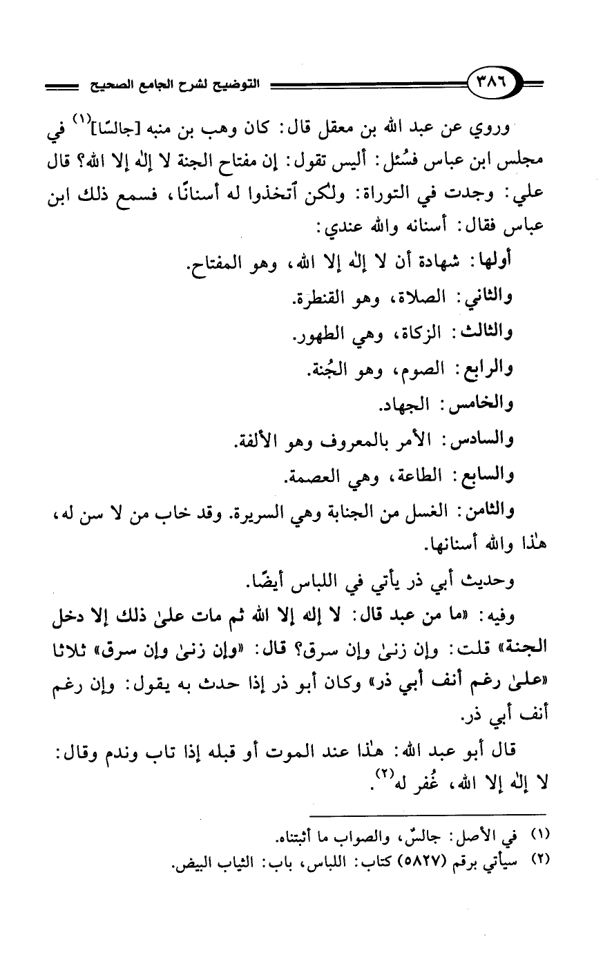 وروي عن عبد الله بن معقل قال: كان وهب بن منبه [جالسًا] (¬1) في مجلس ابن عباس فسُئل: أليس تقول: إن مفتاح الجنة لا إله إلا الله؟ قال علي: وجدت في التوراة: ولكن اتخذوا له أسنانًا، فسمع ذلك ابن عباس فقال: أسنانه والله عندي: