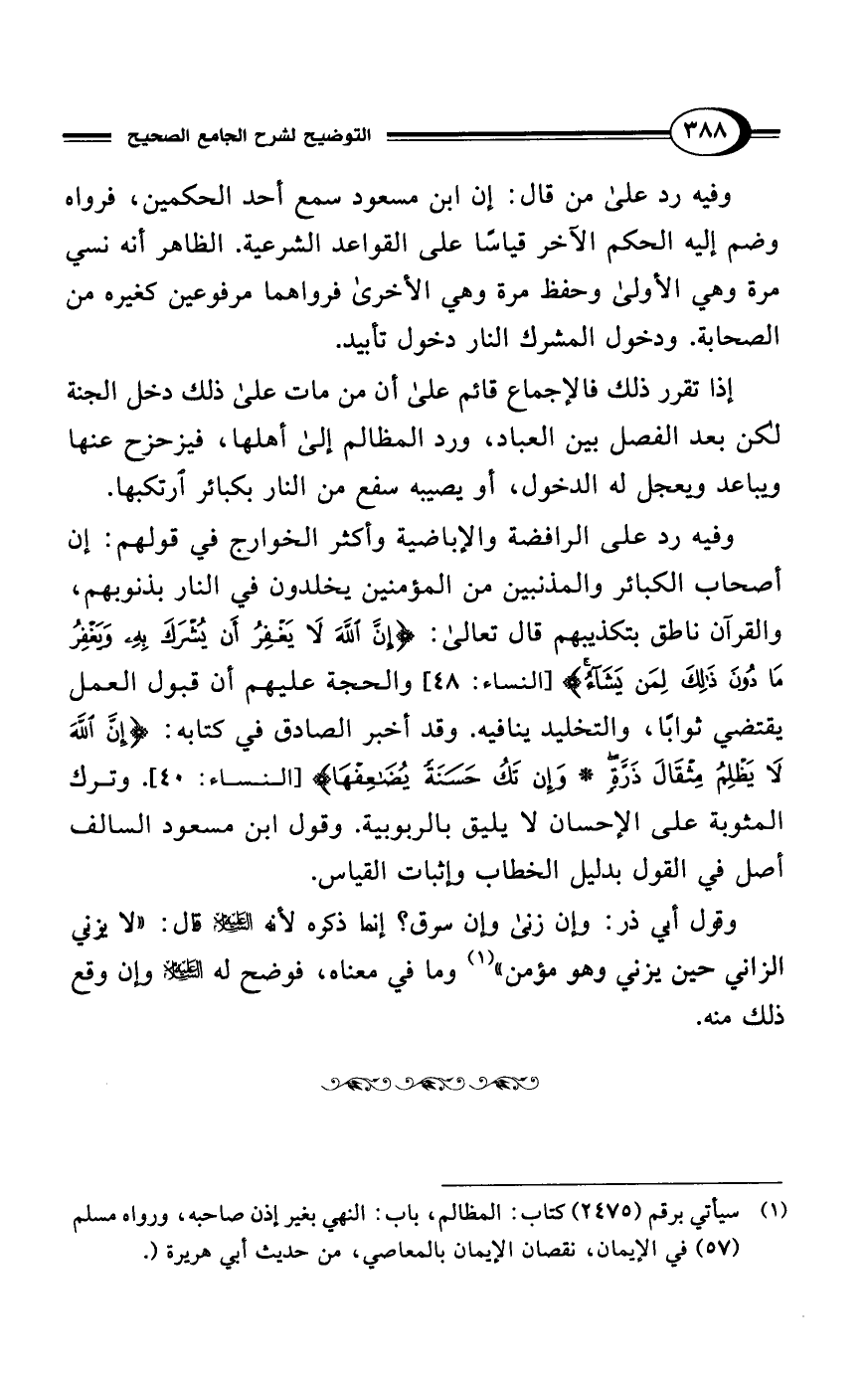 وفيه رد على من قال: إن ابن مسعود سمع أحد الحكمين، فرواه وضم إليه الحكم الآخر قياسًا على القواعد الشرعية. الظاهر أنه نسي مرة وهي الأولى وحفظ مرة وهي الأخرى فرواهما مرفوعين كغيره من الصحابة. ودخول المشرك النار دخول تأبيد.