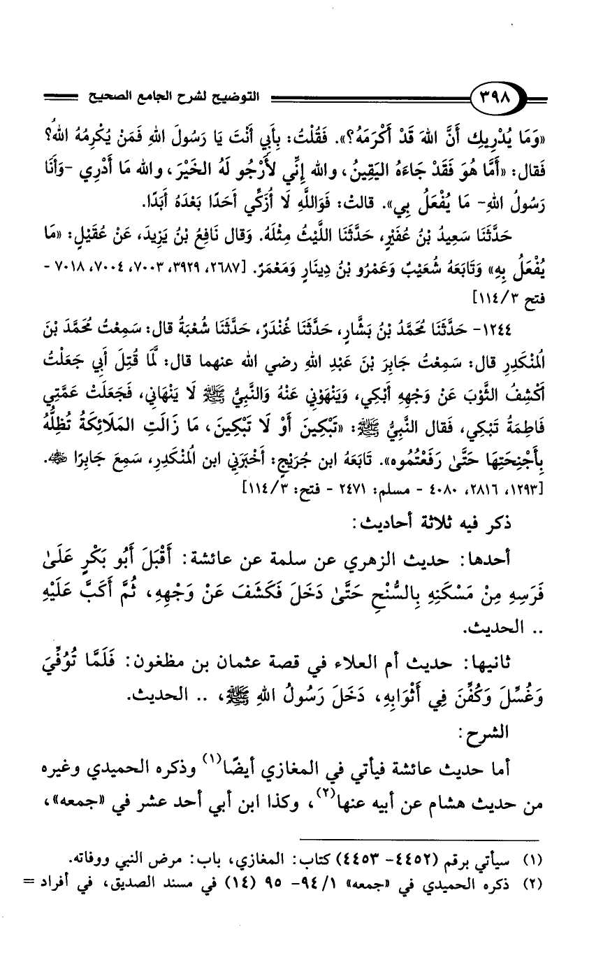 1244 - حَدَّثَنَا مُحَمَّدُ بْنُ بَشَّارٍ، حَدَّثَنَا غُنْدَرٌ، حَدَّثَنَا شُعْبَةُ قَالَ: سَمِعْتُ مُحَمَّدَ بْنَ المُنْكَدِرِ قَالَ: سَمِعْتُ جَابِرَ بْنَ عَبْدِ اللهِ رضي الله عنهما قَالَ: لَمَّا قُتِلَ أَبِي جَعَلْتُ أَكْشِفُ الثَّوْبَ عَنْ وَجْهِهِ أَبْكِي، وَيَنْهَوْنِي عَنْهُ وَالنَّبِيُّ - صلى الله عليه وسلم - لاَ يَنْهَانِي، فَجَعَلَتْ عَمَّتِي فَاطِمَةُ تَبْكِي، فَقَالَ النَّبِيُّ - صلى الله عليه وسلم -: "تَبْكِينَ أَوْ لاَ تَبْكِينَ، مَا زَالَتِ المَلاَئِكَةُ تُظِلُّهُ بِأَجْنِحَتِهَا حَتَّى رَفَعْتُمُوهُ". تَابَعَهُ ابْنُ جُرَيْجٍ: أَخْبَرَنِي ابْنُ المُنْكَدِرِ، سَمِعَ جَابِرًا - رضي الله عنه -. [1293، 2816، 4080 - مسلم: 2471 - فتح: 3/ 114]