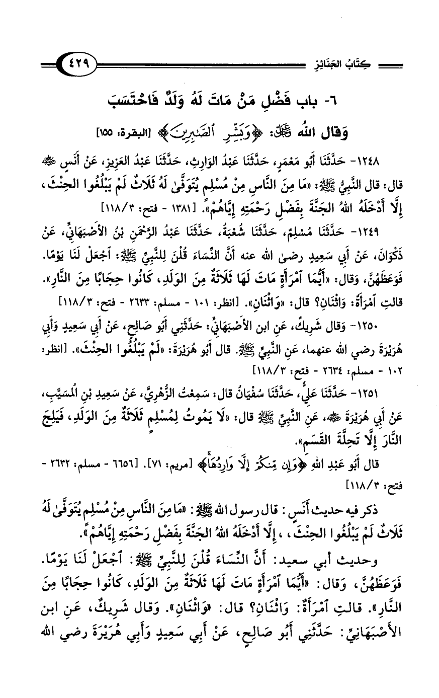 1249 - حَدَّثَنَا مُسْلِمٌ، حَدَّثَنَا شُعْبَةُ، حَدَّثَنَا عَبْدُ الرَّحْمَنِ بْنُ الأَصْبَهَانِيِّ، عَنْ ذَكْوَانَ، عَنْ أَبِي سَعِيدٍ رضي الله عنه أَنَّ النِّسَاءَ قُلْنَ لِلنَّبِىِّ - صلى الله عليه وسلم -: اجْعَلْ لَنَا يَوْمًا. فَوَعَظَهُنَّ، وَقَالَ: "أَيُّمَا امْرَأَةٍ مَاتَ لَهَا ثَلاَثَةٌ مِنَ الوَلَدِ، كَانُوا حِجَابًا مِنَ النَّارِ". قَالَتِ امْرَأَةٌ: وَاثْنَانِ؟ قَالَ "وَاثْنَانِ". [انظر: 101 - مسلم: 2633 - فتح: 3/ 118]