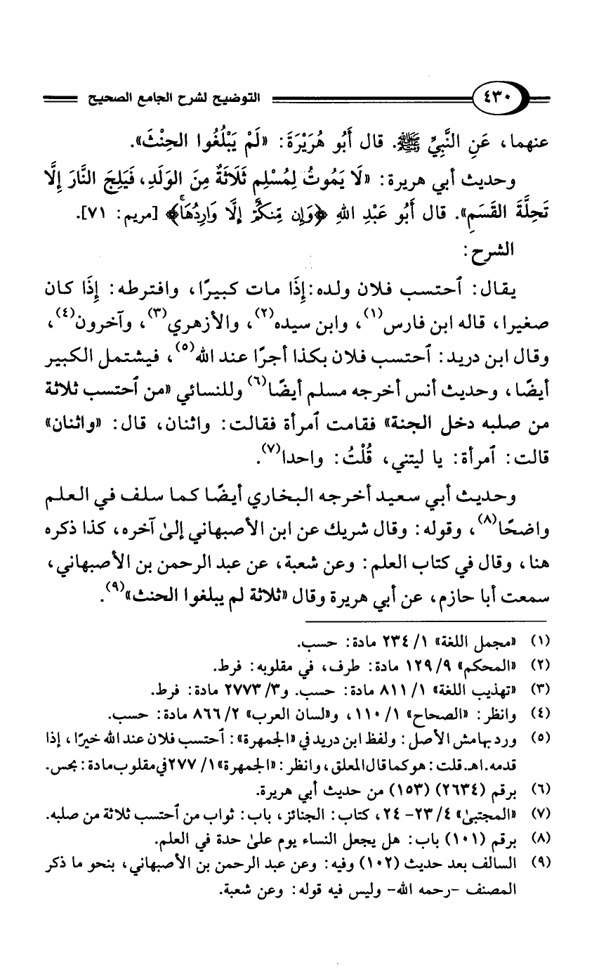وحديث أبي هريرة: "لَا يَمُوتُ لِمُسْلِم ثَلَاَثةٌ مِنَ الوَلَدِ، فَيَلِجَ النَّارَ إِلَّا تَحِلَّةَ القَسَمِ". قال أَبُو عَبْدِ اللهِ {وَإِنْ مِنْكُمْ إِلَّا وَارِدُهَا} [مريم: 71].
