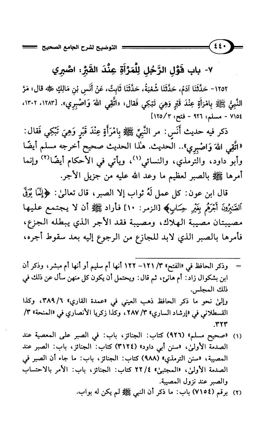 1252 - حَدَّثَنَا آدَمُ، حَدَّثَنَا شُعْبَةُ، حَدَّثَنَا ثَابِتٌ، عَنْ أَنَسِ بْنِ مَالِكٍ - رضي الله عنه - قَالَ: مَرَّ النَّبِيُّ - صلى الله عليه وسلم - بِامْرَأَةٍ عِنْدَ قَبْرٍ وَهِيَ تَبْكِي فَقَالَ: "اتَّقِي اللهَ وَاصْبِرِي". [1283، 1302، 7154 - مسلم: 926 - فتح: 3/ 125]
