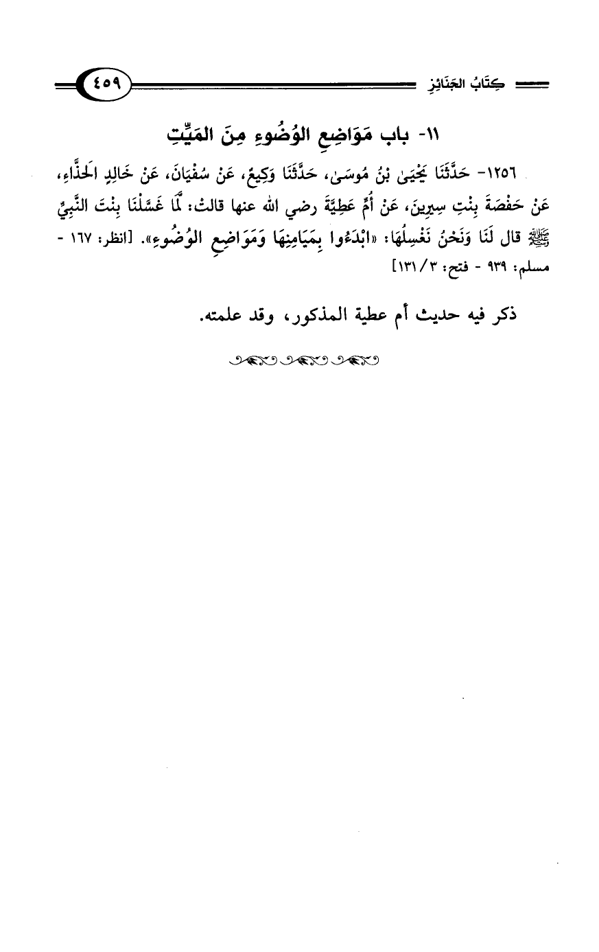 1256 - حَدَّثَنَا يَحْيَى بْنُ مُوسَى، حَدَّثَنَا وَكِيعٌ عَنْ سُفْيَانَ، عَنْ خَالِدٍ الحَذَّاءِ، عَنْ حَفْصَةَ بِنْتِ سِيرِينَ، عَنْ أُمِّ عَطِيَّةَ رضي الله عنها قَالَتْ: لَمَّا غَسَّلْنَا بِنْتَ النَّبِيِّ - صلى الله عليه وسلم - قَالَ لَنَا وَنَحْنُ نَغْسِلُهَا: "ابْدَأْنَ بِمَيَامِنِهَا وَمَوَاضِعِ الوُضُوءِ". [انظر: 167 - مسلم: 939 - فتح: 3/ 131]