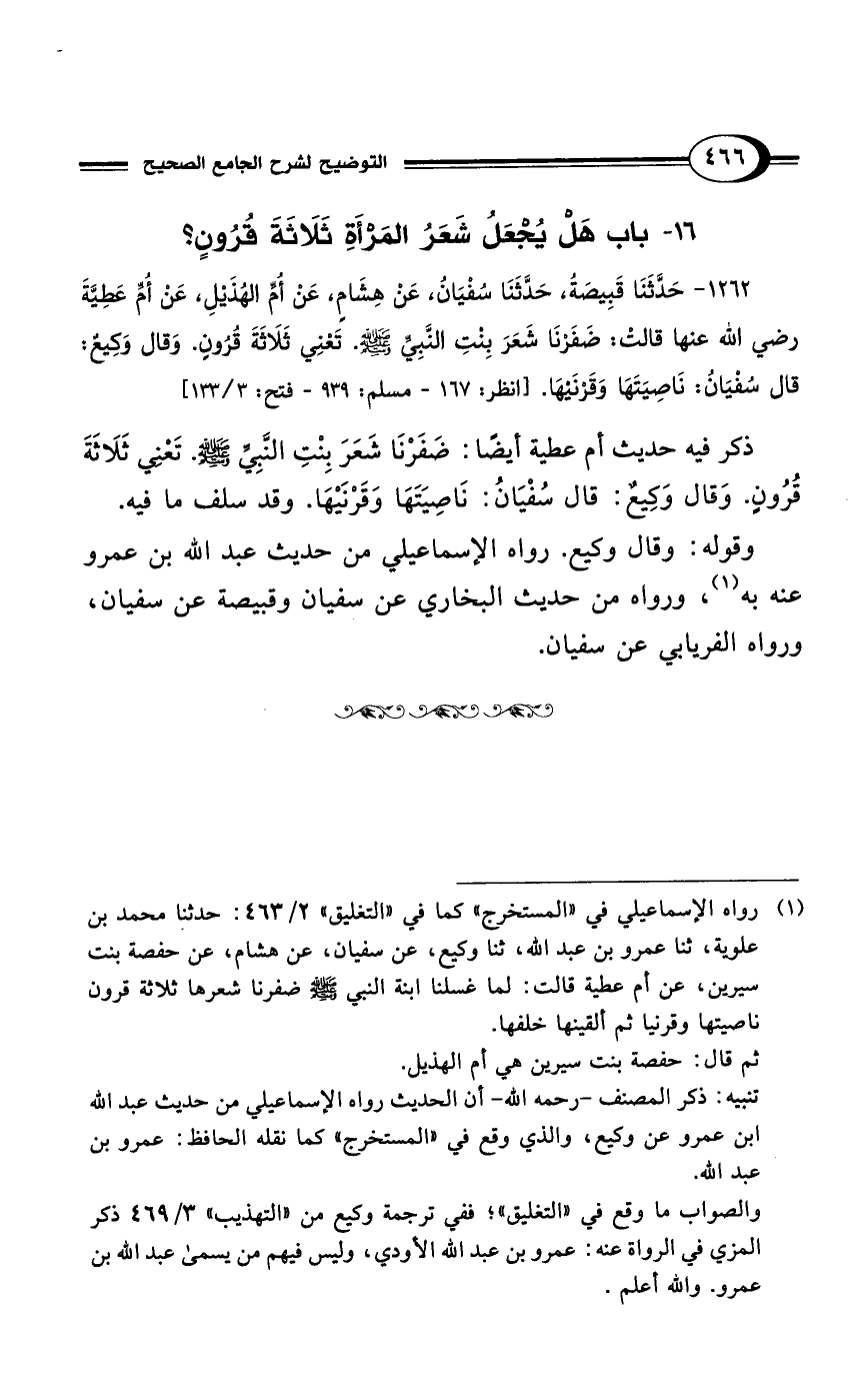 1262 - حَدَّثَنَا قَبِيصَةُ، حَدَّثَنَا سُفْيَانُ، عَنْ هِشَامٍ، عَنْ أُمِّ الهُذَيْلِ، عَنْ أُمِّ عَطِيَّةَ رضي الله عنها قَالَتْ: ضَفَرْنَا شَعَرَ بِنْتِ النَّبِيِّ - صلى الله عليه وسلم -. تَعْنِي ثَلاَثَةَ قُرُونٍ. وَقَالَ وَكِيعٌ: قَالَ سُفْيَانُ: نَاصِيَتَهَا وَقَرْنَيْهَا. [انظر: 167 - مسلم: 939 - فتح: 3/ 133]