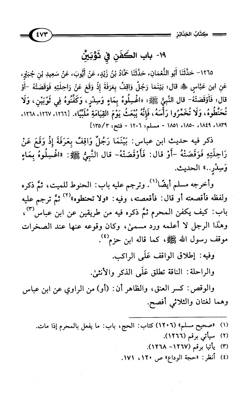 1265 - حَدَّثَنَا أَبُو النُّعْمَانِ، حَدَّثَنَا حَمَّادُ بْنُ زَيْدٍ، عَنْ أَيُّوبَ، عَنْ سَعِيدِ بْنِ جُبَيْرٍ، عَنِ ابْنِ عَبَّاسٍ - رضي الله عنهم - قَالَ: بَيْنَمَا رَجُلٌ وَاقِفٌ بِعَرَفَةَ إِذْ وَقَعَ عَنْ رَاحِلَتِهِ فَوَقَصَتْهُ -أَوْ قَالَ: فَأَوْقَصَتْهُ- قَالَ: النَّبِيُّ - صلى الله عليه وسلم -: "اغْسِلُوهُ بِمَاءٍ وَسِدْرٍ، وَكَفِّنُوهُ فِي ثَوْبَيْنِ، وَلاَ تُحَنِّطُوهُ، وَلاَ تُخَمِّرُوا رَأْسَهُ، فَإِنَّهُ يُبْعَثُ يَوْمَ القِيَامَةِ مُلَبِّيًا". [1266، 1267، 1268، 1839، 1849، 1850، 1851 - مسلم: 1206 - فتح: 3/ 135]