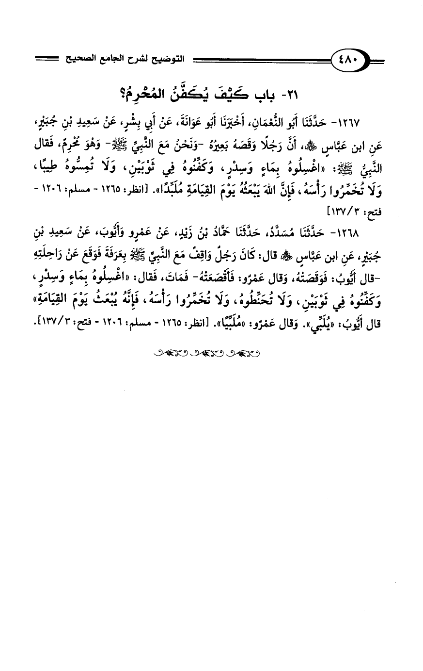 1268 - حَدَّثَنَا مُسَدَّدٌ، حَدَّثَنَا حَمَّادُ بْنُ زَيْدٍ، عَنْ عَمْرٍو وَأَيُّوبَ، عَنْ سَعِيدِ بْنِ جُبَيْرٍ، عَنِ ابْنِ عَبَّاسٍ - رضي الله عنهم - قَالَ: كَانَ رَجُلٌ وَاقِفٌ مَعَ النَّبِيِّ - صلى الله عليه وسلم - بِعَرَفَةَ فَوَقَعَ عَنْ رَاحِلَتِهِ -قَالَ أَيُّوبُ: فَوَقَصَتْهُ، وَقَالَ عَمْرٌو: فَأَقْصَعَتْهُ- فَمَاتَ، فَقَالَ: "اغْسِلُوهُ بِمَاءٍ وَسِدْرٍ، وَكَفِّنُوهُ فِي ثَوْبَيْنِ، وَلاَ تُحَنِّطُوهُ، وَلاَ تُخَمِّرُوا رَأْسَهُ، فَإِنَّهُ يُبْعَثُ يَوْمَ القِيَامَةِ" قَالَ أَيُّوبُ: "يُلَبِّي". وَقَالَ عَمْرٌو: "مُلَبِّيًا". [انظر: 1265 - مسلم: 1206 - فتح: 3/ 137].