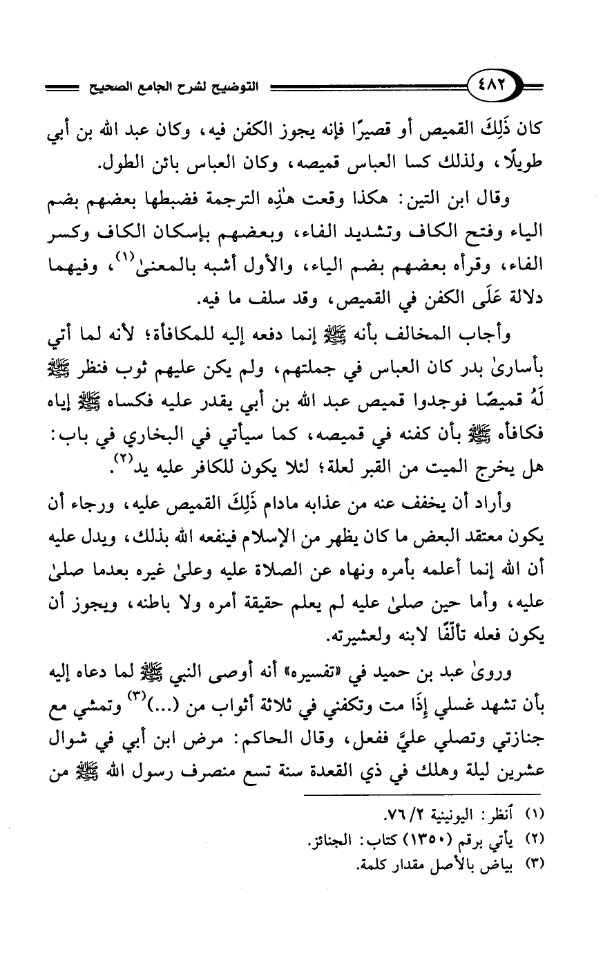 وأجاب المخالف بأنه - صلى الله عليه وسلم - إنما دفعه إليه للمكافأة؛ لأنه لما أتي بأسارى بدر كان العباس في جملتهم، ولم يكن عليهم ثوب فنظر - صلى الله عليه وسلم - لَهُ قميصًا فوجدوا قميص عبد الله بن أبي يقدر عليه فكساه - صلى الله عليه وسلم - إياه فكافأه - صلى الله عليه وسلم - بأن كفنه في قميصه، كما سيأتي في البخاري في باب: هل يخرج الميت من القبر لعلة؛ لئلا يكون للكافر عليه يد (¬2).