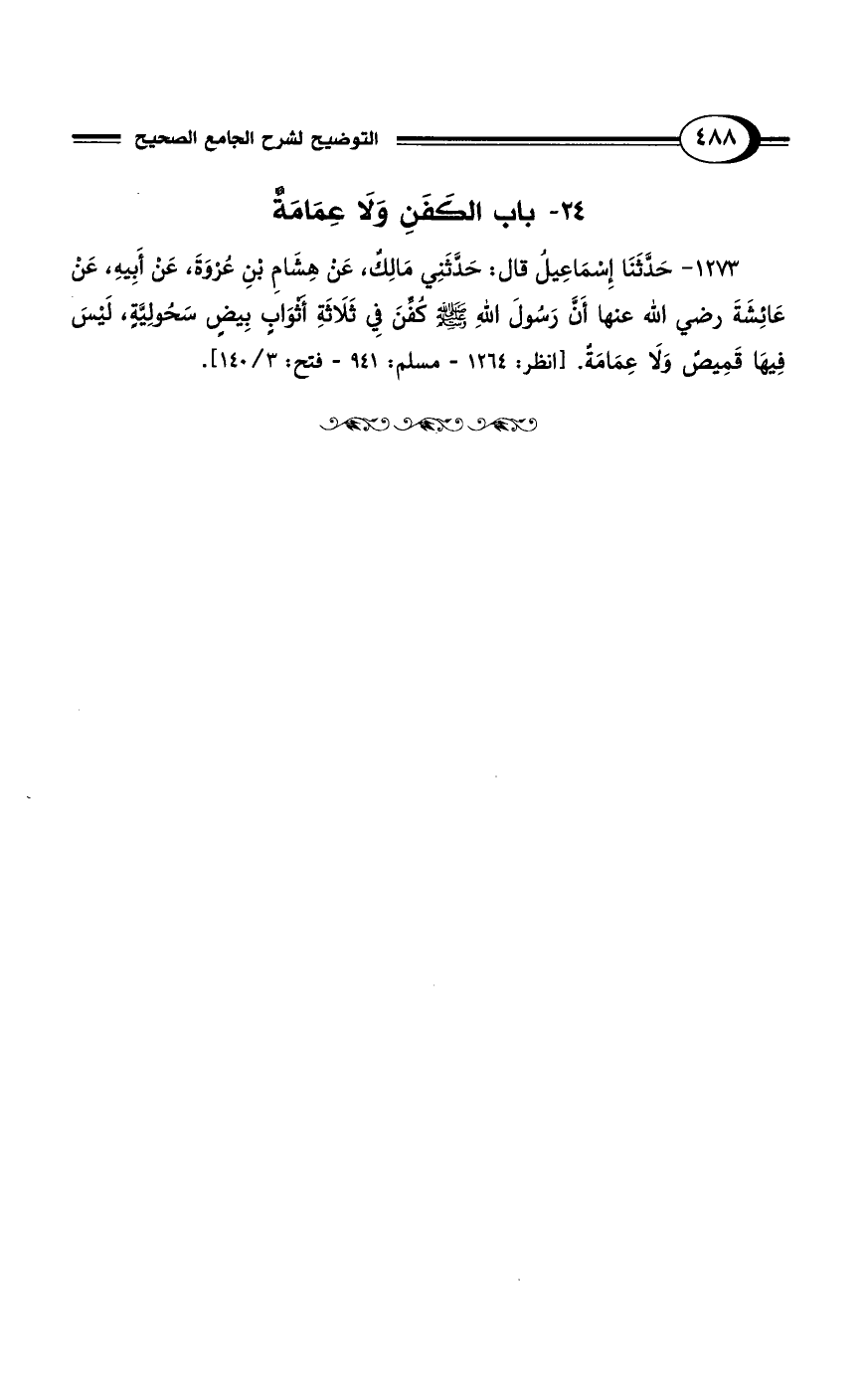 1273 - حَدَّثَنَا إِسْمَاعِيلُ قَالَ: حَدَّثَنِي مَالِكٌ، عَنْ هِشَامِ بْنِ عُرْوَةَ، عَنْ أَبِيهِ، عَنْ عَائِشَةَ رضي الله عنها أَنَّ رَسُولَ اللهِ - صلى الله عليه وسلم - كُفِّنَ فِي ثَلاَثَةِ أَثْوَابٍ بِيضٍ سَحُولِيَّةٍ، لَيْسَ فِيهَا قَمِيصٌ وَلاَ عِمَامَةٌ. [انظر: 1264 - مسلم: 941 - فتح: 3/ 140].