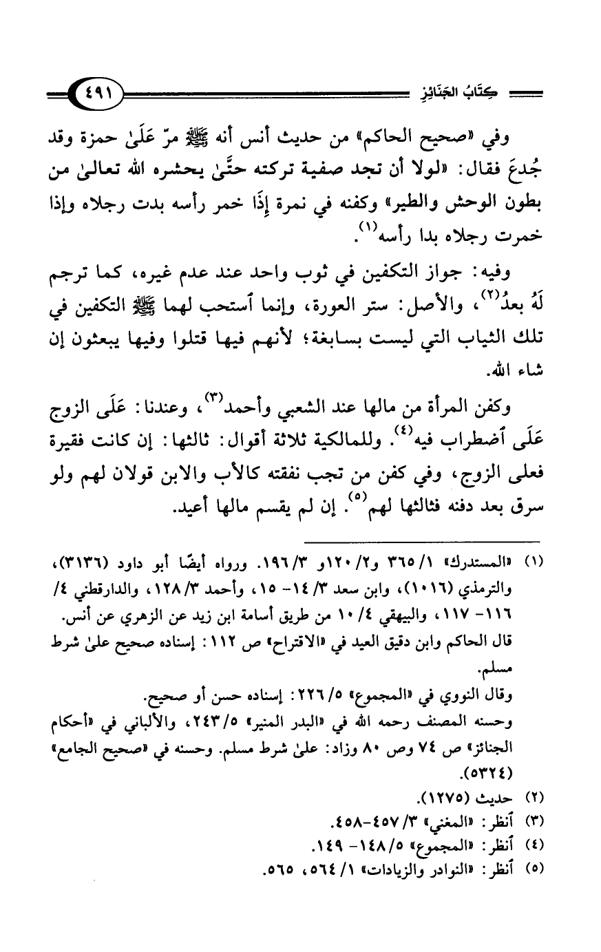 وفي "صحيح الحاكم" من حديث أنس أنه - صلى الله عليه وسلم - مرّ عَلَى حمزة وقد جُدع فقال: "لولا أن تجد صفية تركته حتَّى يحشره الله تعالى من بطون الوحش والطير" وكفنه في نمرة إِذَا خمر رأسه بدت رجلاه وإذا خمرت رجلاه بدا رأسه (¬1).