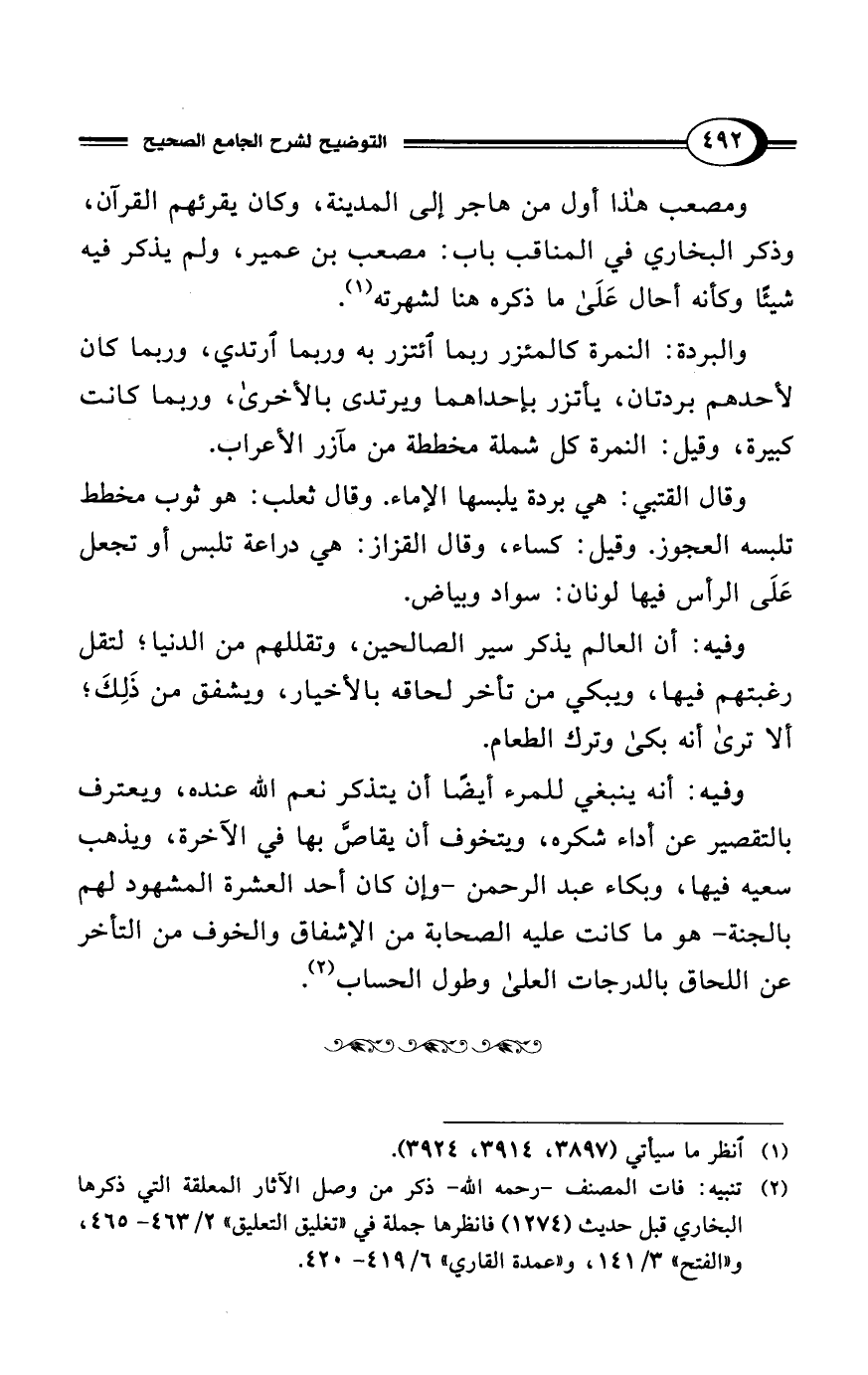 وفيه: أنه ينبغي للمرء أيضًا أن يتذكر نعم الله عنده، ويعترف بالتقصير عن أداء شكره، ويتخوف أن يقاصَّ بها في الآخرة، ويذهب سعيه فيها، وبكاء عبد الرحمن -وإن كان أحد العشرة المشهود لهم بالجنة- هو ما كانت عليه الصحابة من الإشفاق والخوف من التأخر عن اللحاق بالدرجات العلى وطول الحساب (¬2).