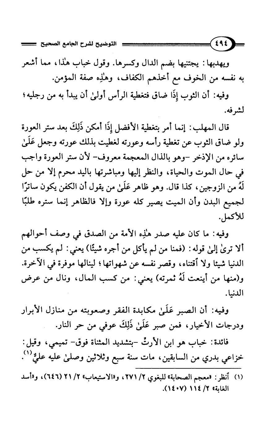 فائدة: خباب هو ابن الأرتِّ -بتشديد المثناة فوق- تميمي، وقيل: خزاعي بدري من السابقين، مات سنة سبع وثلاثين وصلى عليه عليٌّ (¬1).