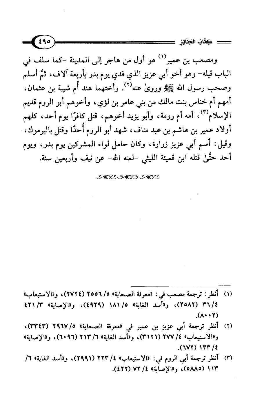 (¬1) انظر: ترجمة مصعب في: "معرفة الصحابة" 5/ 2556 (2724)، و"الاستيعاب" 4/ 36 (2582)، و"أسد الغابة" 5/ 181 (4929)، و"الاصابة" 3/ 421 (8002).