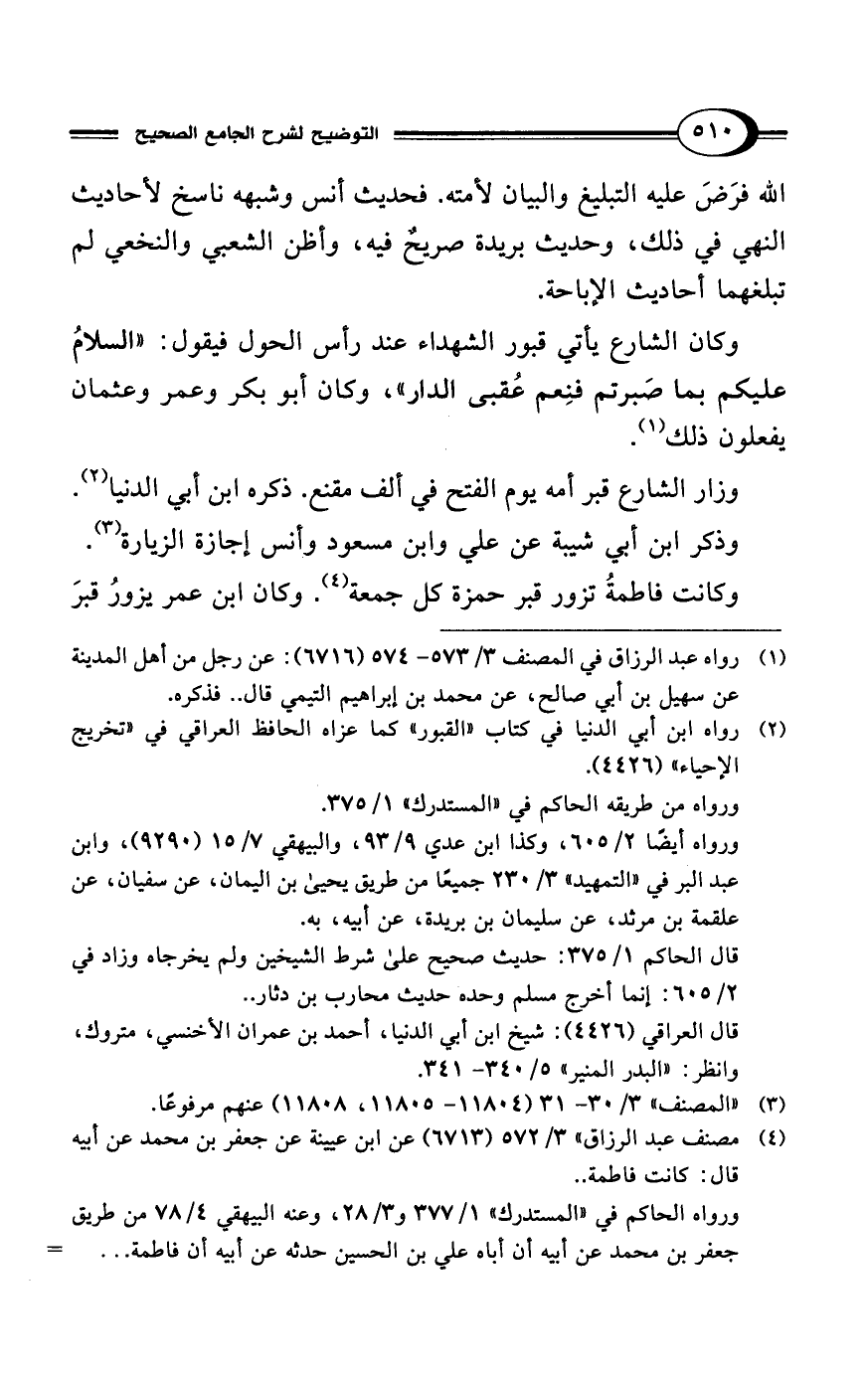 وكان الشارع يأتي قبور الشهداء عند رأس الحول فيقول: "السلامُ عليكم بما صَبرتم فنِعم عُقبى الدارد"، وكان أبو بكر وعمر وعثمان يفعلون ذلك (¬1).